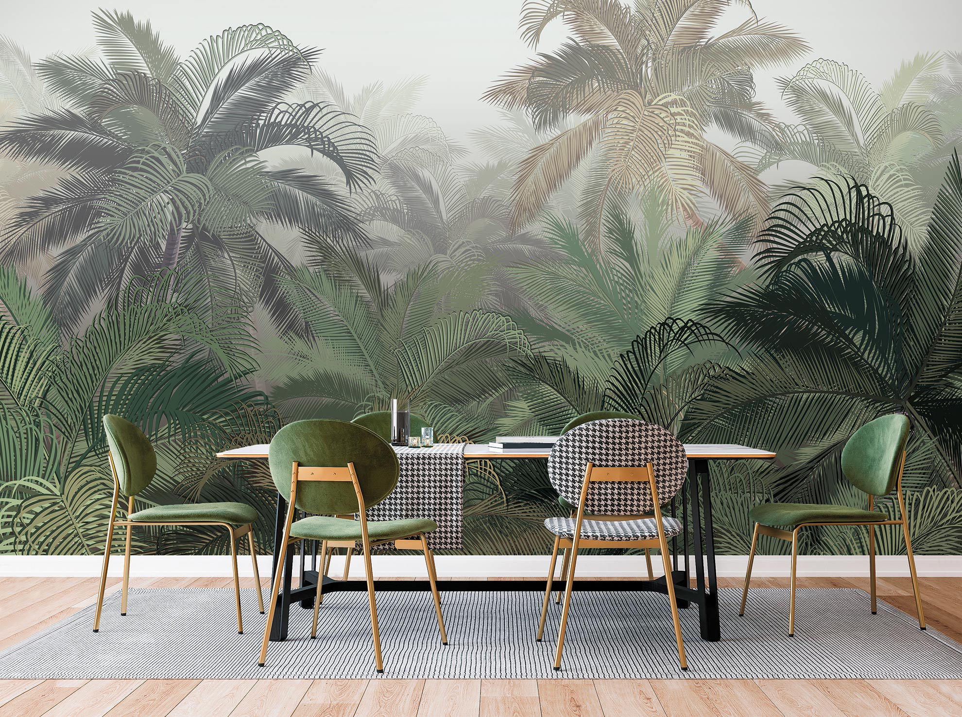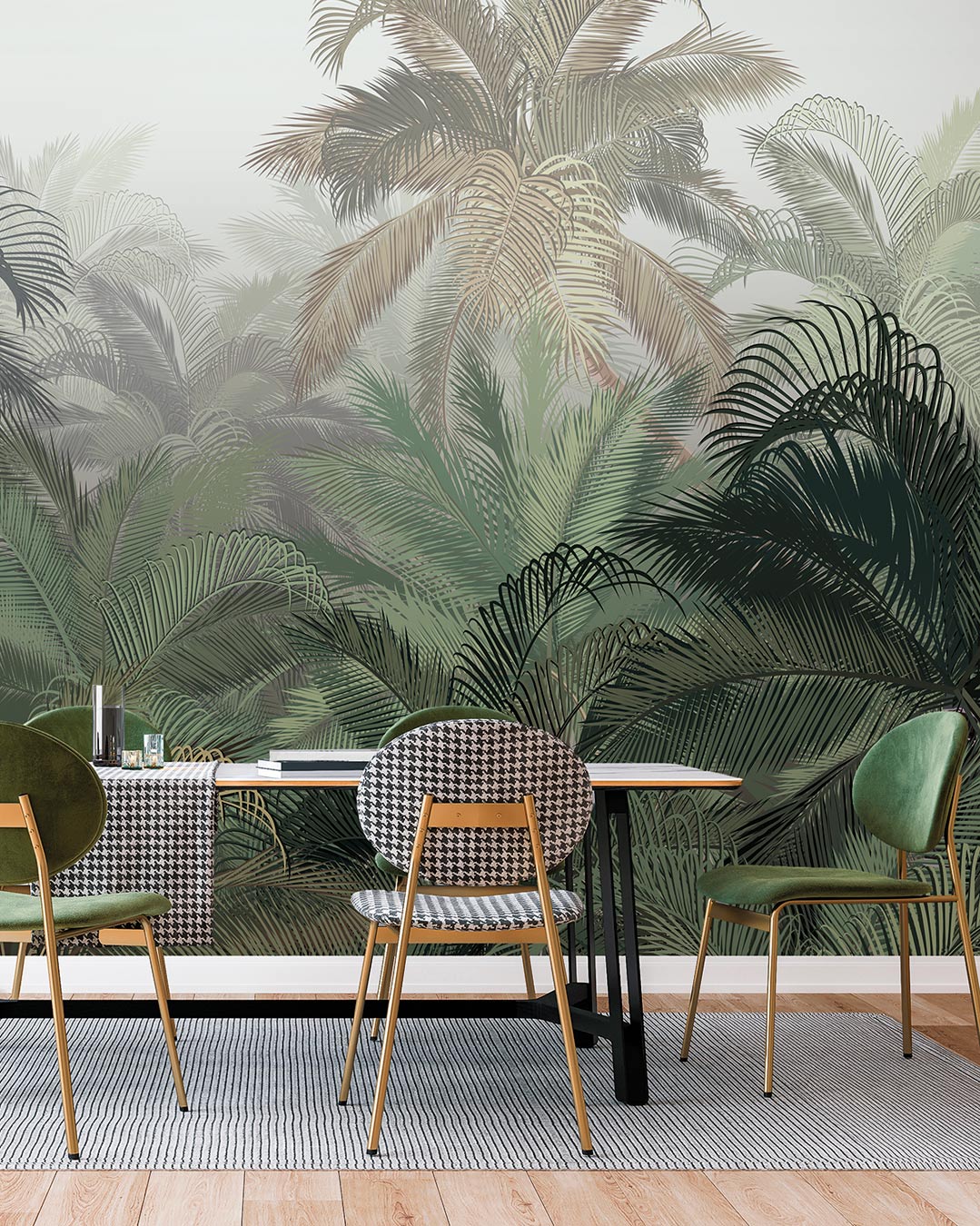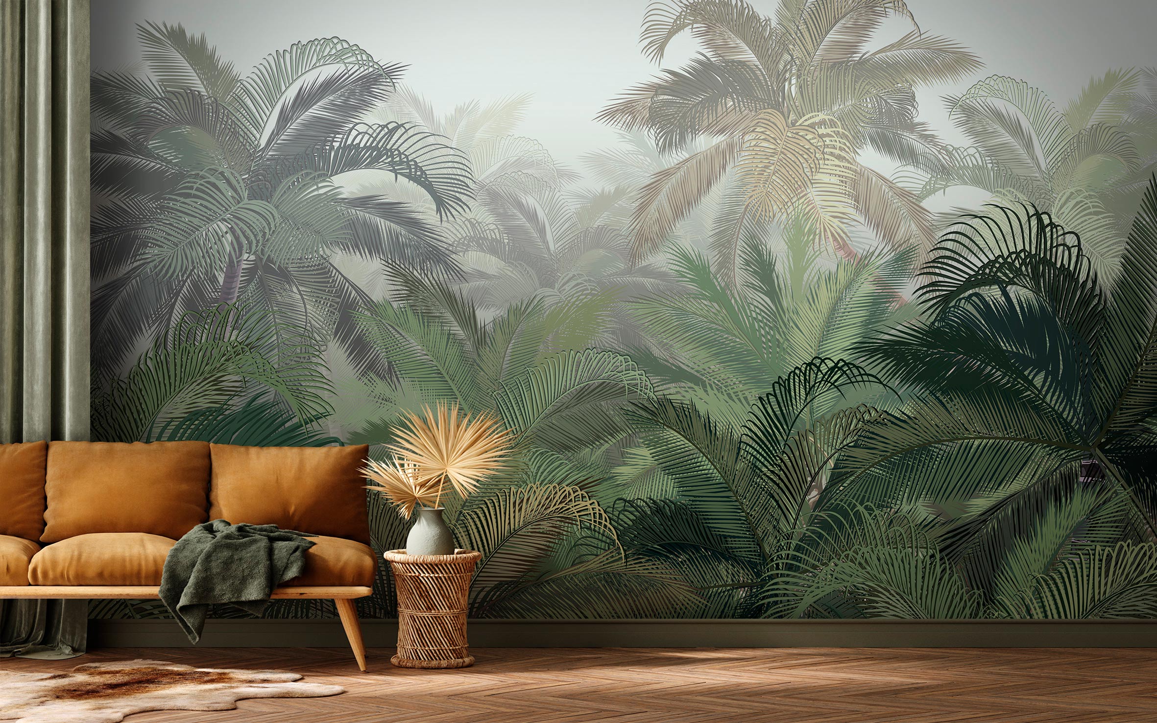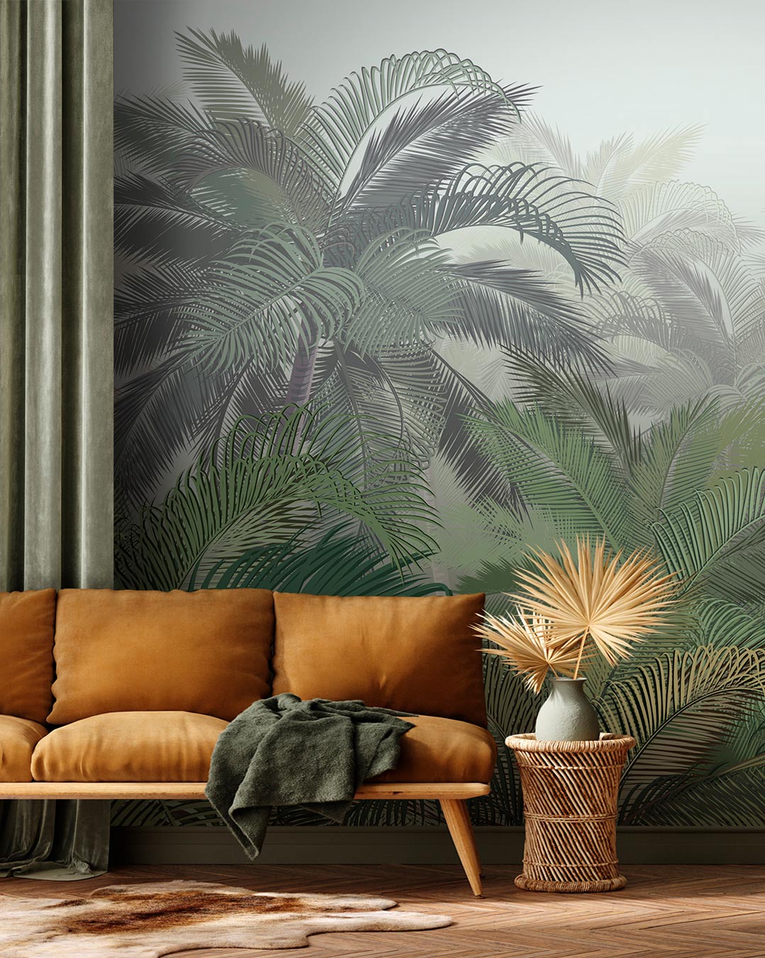 Le papier peint BALATA ressemble à s’y méprendre à une photo tant son design est réaliste. La végétation foisonnante exotique apparaît dans différentes tonalités : kaki, beige ou vert sombre. Les feuilles en éventail des palmiers sont dessinées avec finesse. Le ciel surplombe la nature tropicale dans un bleu pâle teinté de gris. En arrière-plan, les arbres sont un peu flous, comme recouverts d’un voile de brume. La pluie semble se préparer.