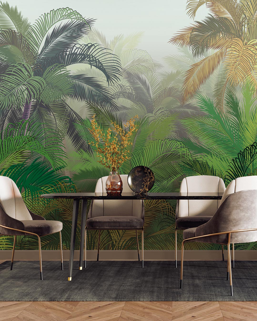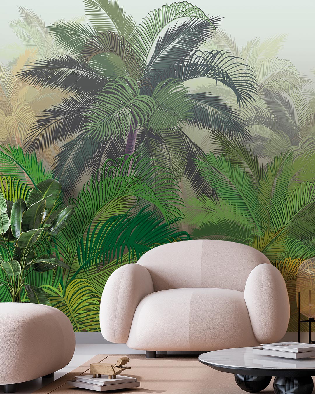 Le papier peint BALATA ressemble à s’y méprendre à une photo tant son design est réaliste. La végétation foisonnante exotique apparaît dans différentes tonalités : kaki, beige ou vert sombre. Les feuilles en éventail des palmiers sont dessinées avec finesse. Le ciel surplombe la nature tropicale dans un bleu pâle teinté de gris. En arrière-plan, les arbres sont un peu flous, comme recouverts d’un voile de brume. La pluie semble se préparer.