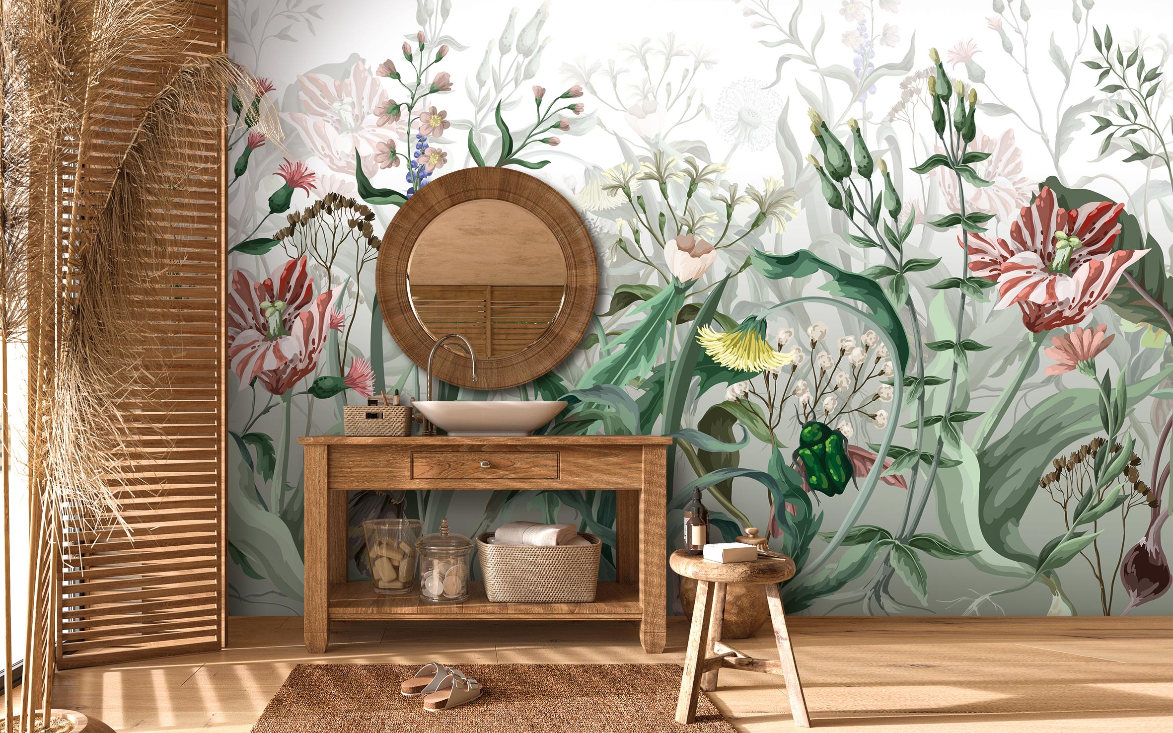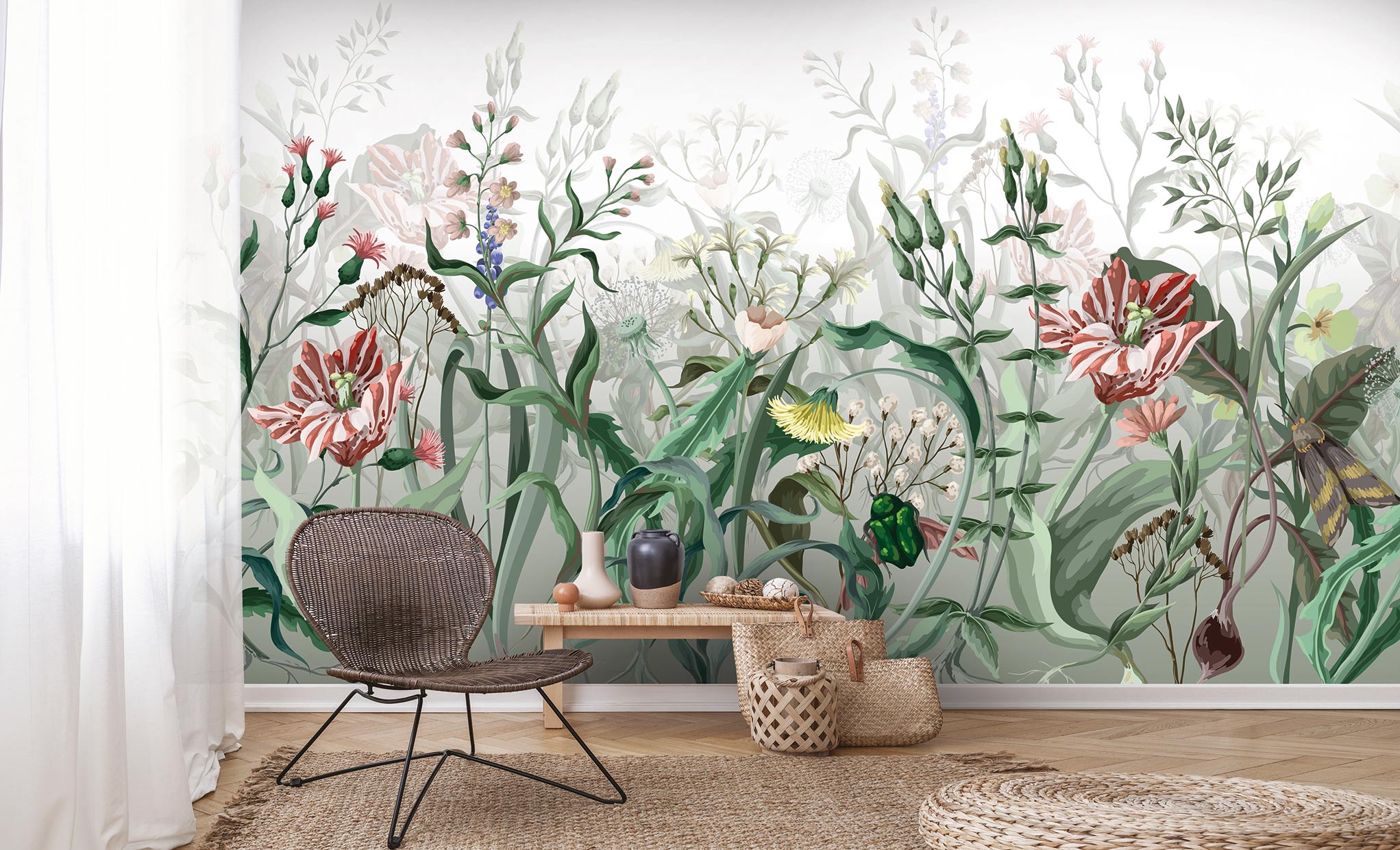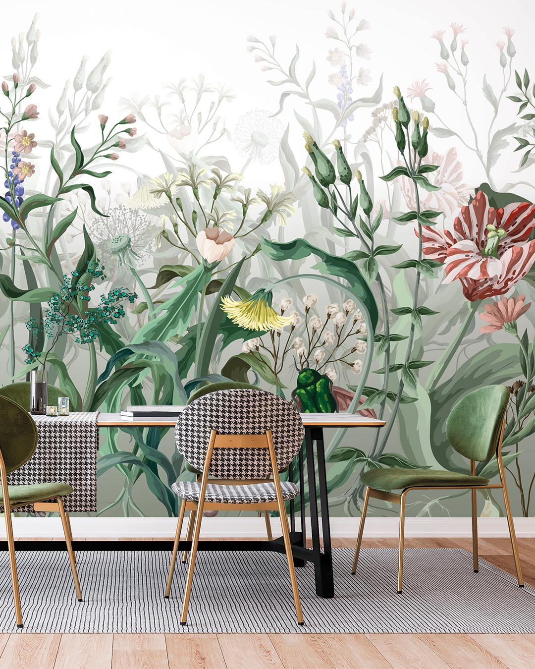 Sur fond vert ou sur fond blanc, des fleurs des champs géantes poussent en vrac sur le décor mural. La nature est à l’œuvre et prend toute sa place. Le papier peint affiche un désordre gai et printanier, en mêlant les variétés florales. La tapisserie impose la saison et ses couleurs. En arrière-plan, encore des fleurs ! La discrétion est oubliée au profit de la beauté pure de la nature.