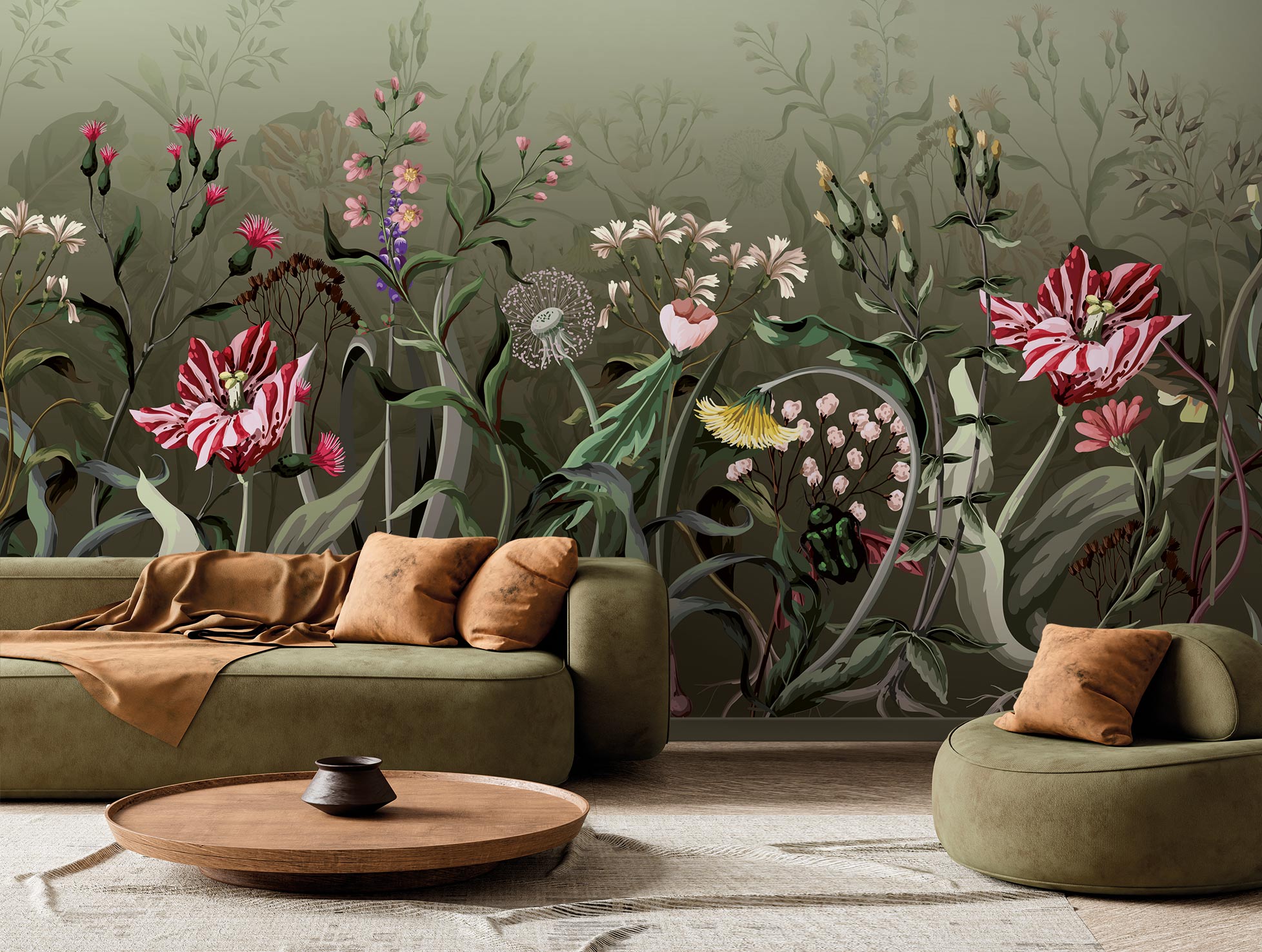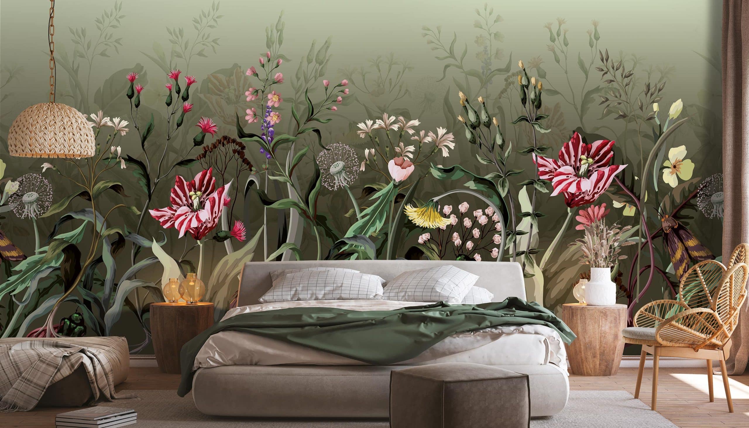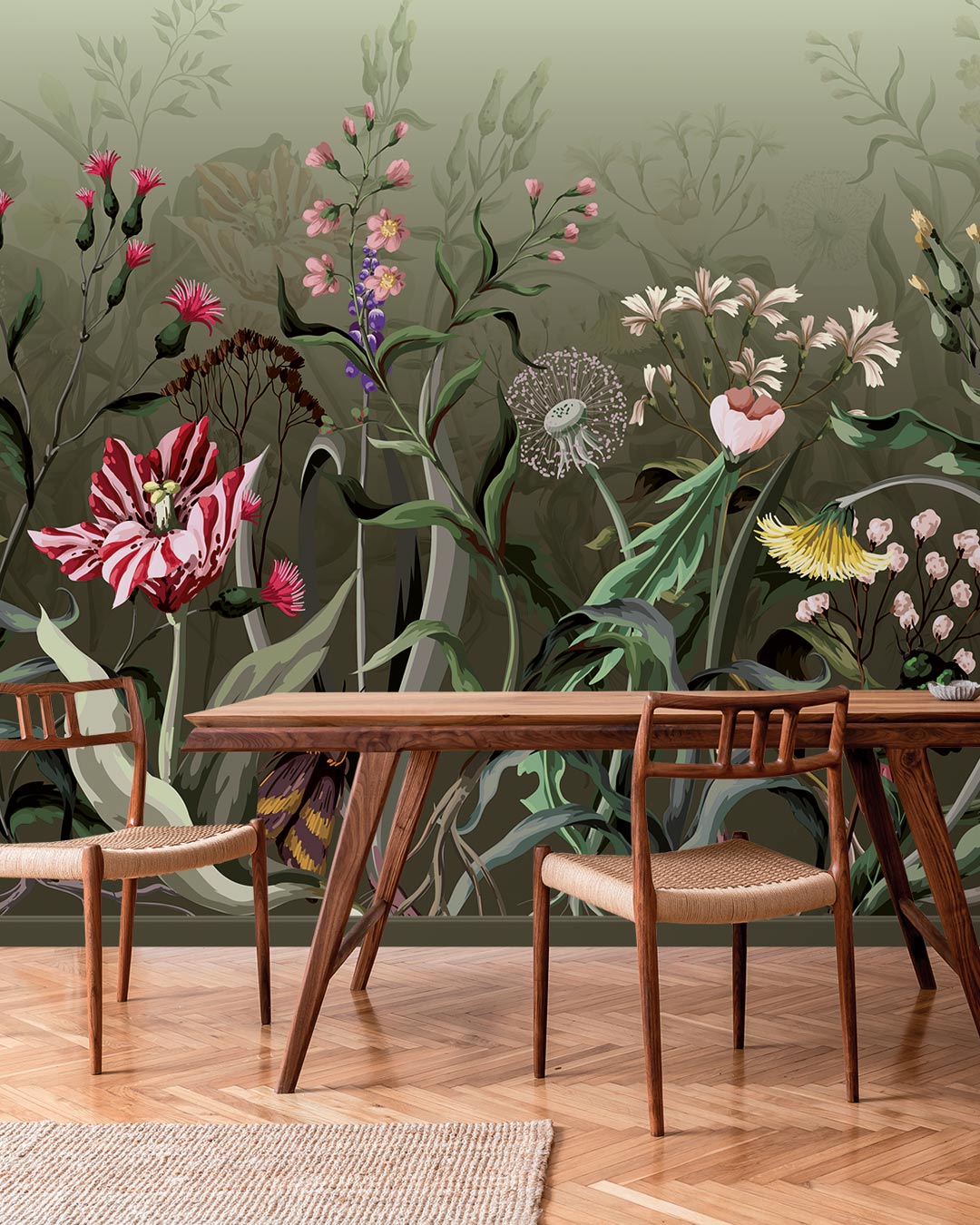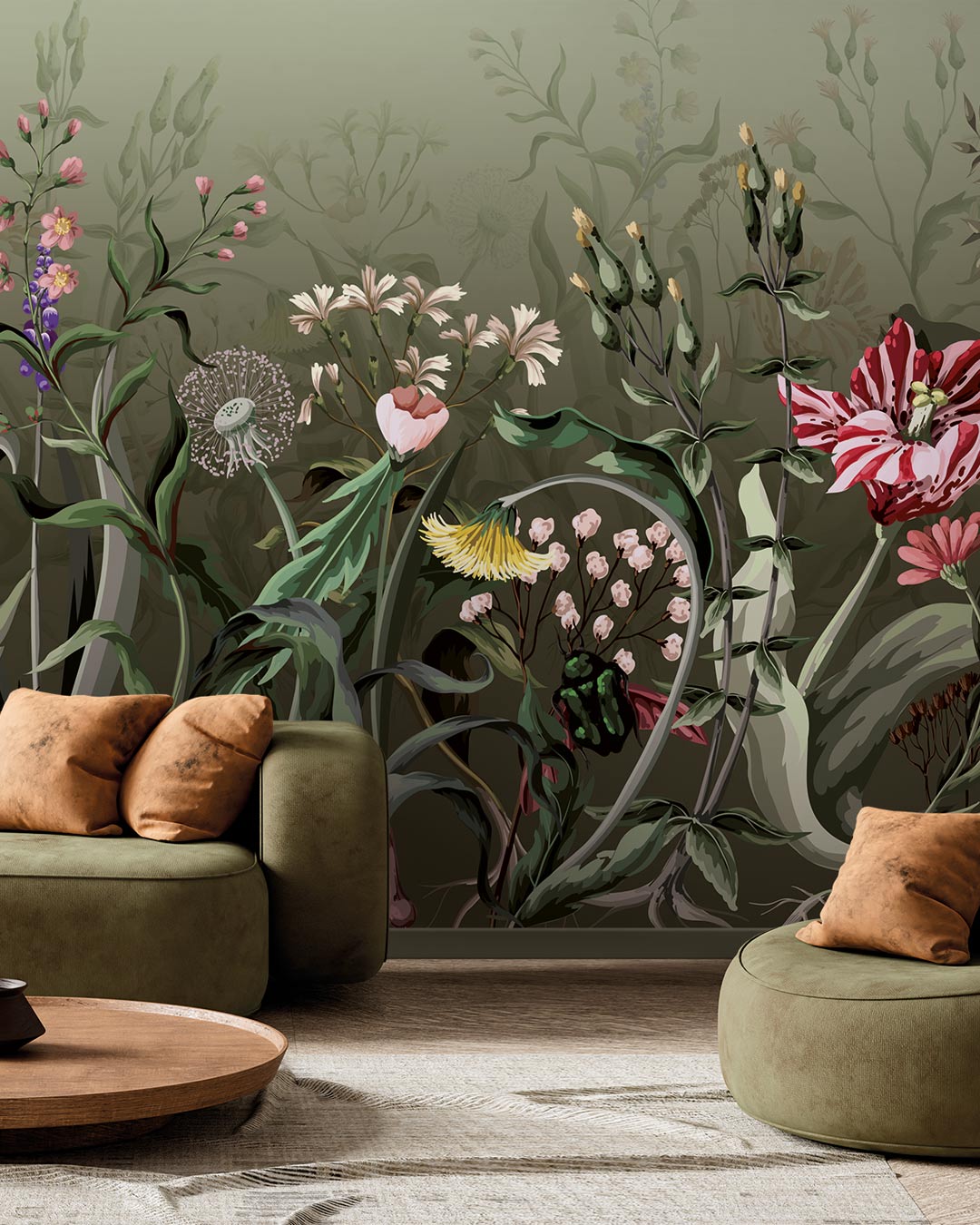Sur fond vert ou sur fond blanc, des fleurs des champs géantes poussent en vrac sur le décor mural. La nature est à l’œuvre et prend toute sa place. Le papier peint affiche un désordre gai et printanier, en mêlant les variétés florales. La tapisserie impose la saison et ses couleurs. En arrière-plan, encore des fleurs ! La discrétion est oubliée au profit de la beauté pure de la nature.