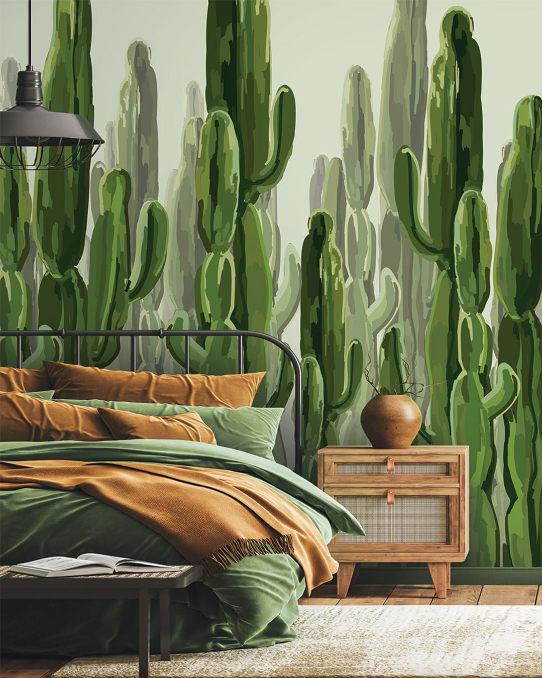 Sur un fond vert ou sur un fond blanc, les cactus envahissent le décor mural. Les traits et contours sont approximatifs pour magnifier l’effet. La tapisserie joue avec les différentes tonalités de vert du végétal pour lui donner de l’épaisseur et du relief. La nature est brute et sauvage, sans compromis. Le papier peint devient un gage d’oxygène pour créer une décoration inspirante et sereine.