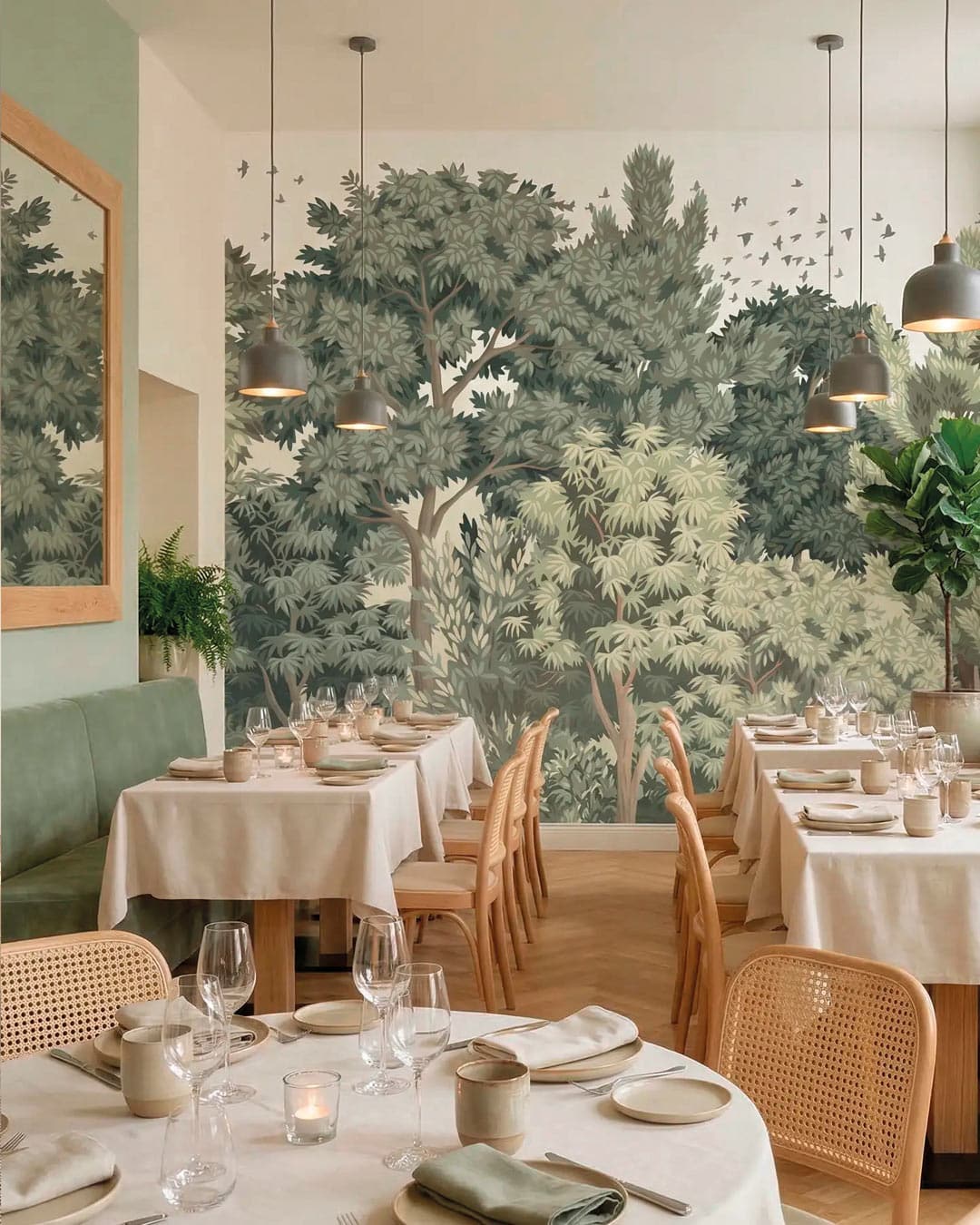 Le modèle de papier peint existe en trois versions colorées : une variation de vert, une variation de brun, et une dernière blanche et gris clair. On aime son dessin enveloppant. Les arbres et leurs feuilles deviennent un écrin pour l’intérieur.