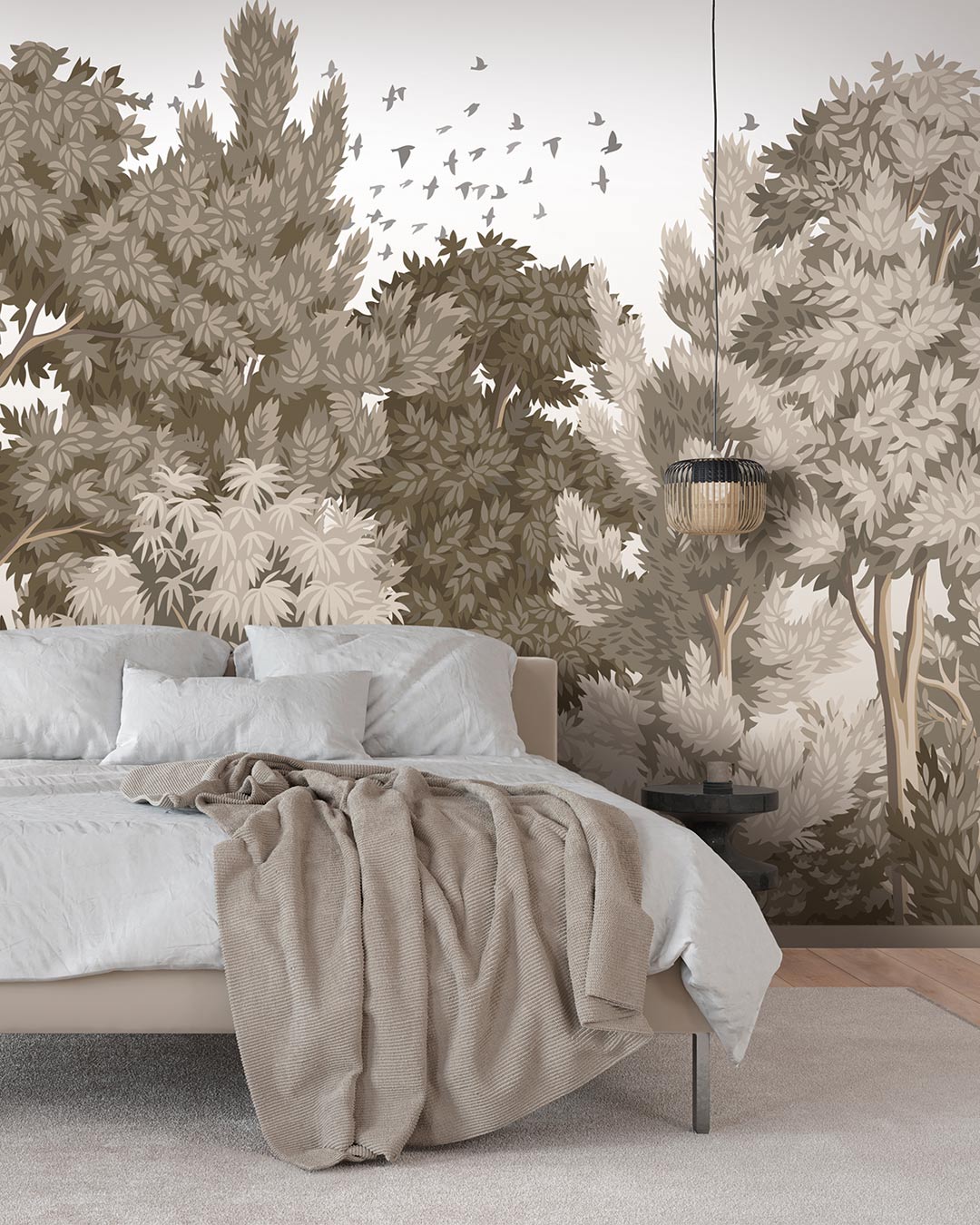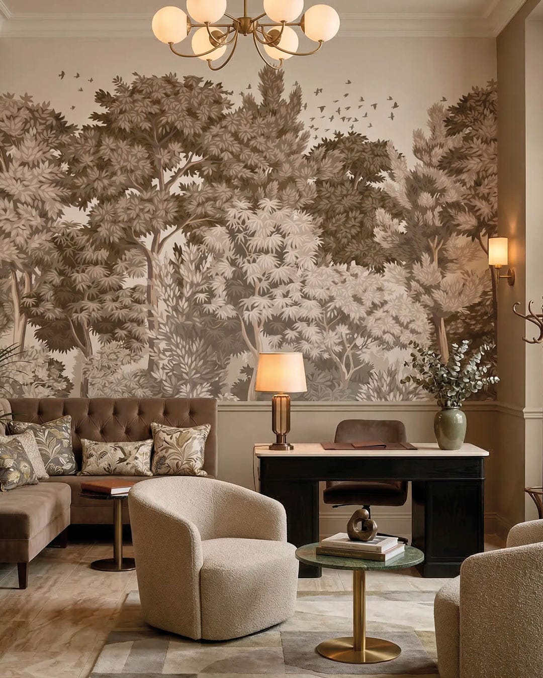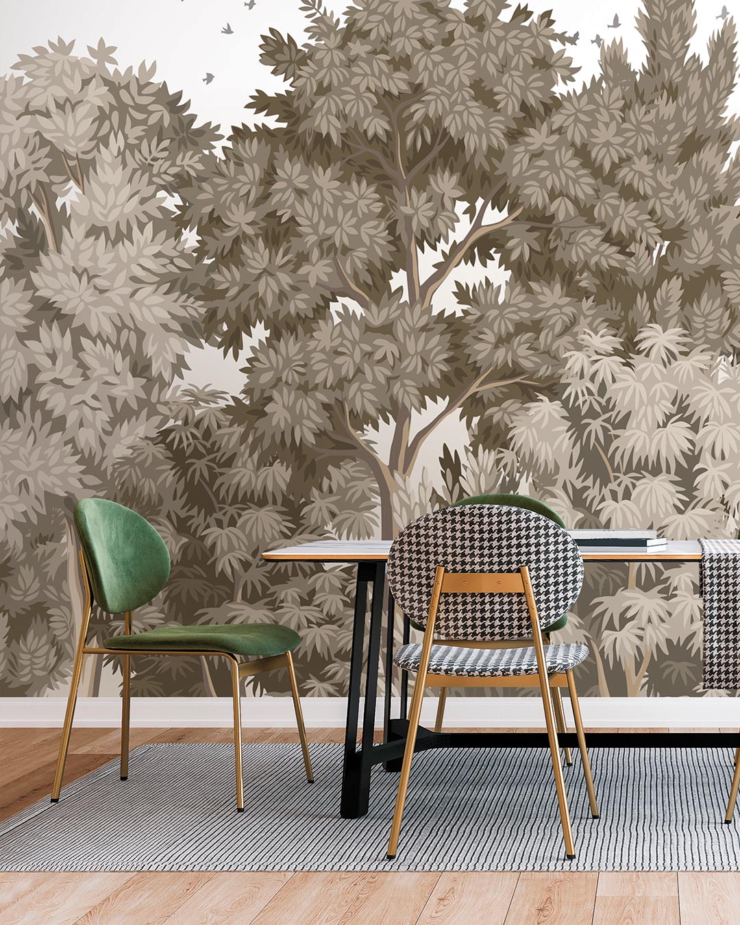 Le modèle de papier peint existe en trois versions colorées : une variation de vert, une variation de brun, et une dernière blanche et gris clair. On aime son dessin enveloppant. Les arbres et leurs feuilles deviennent un écrin pour l’intérieur.