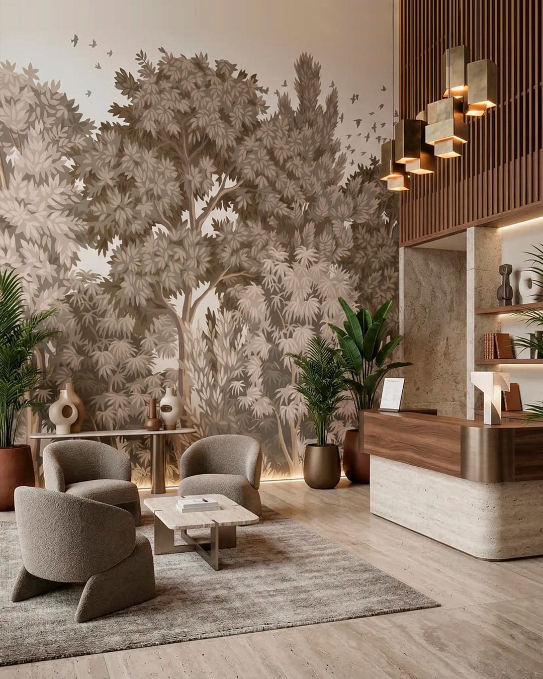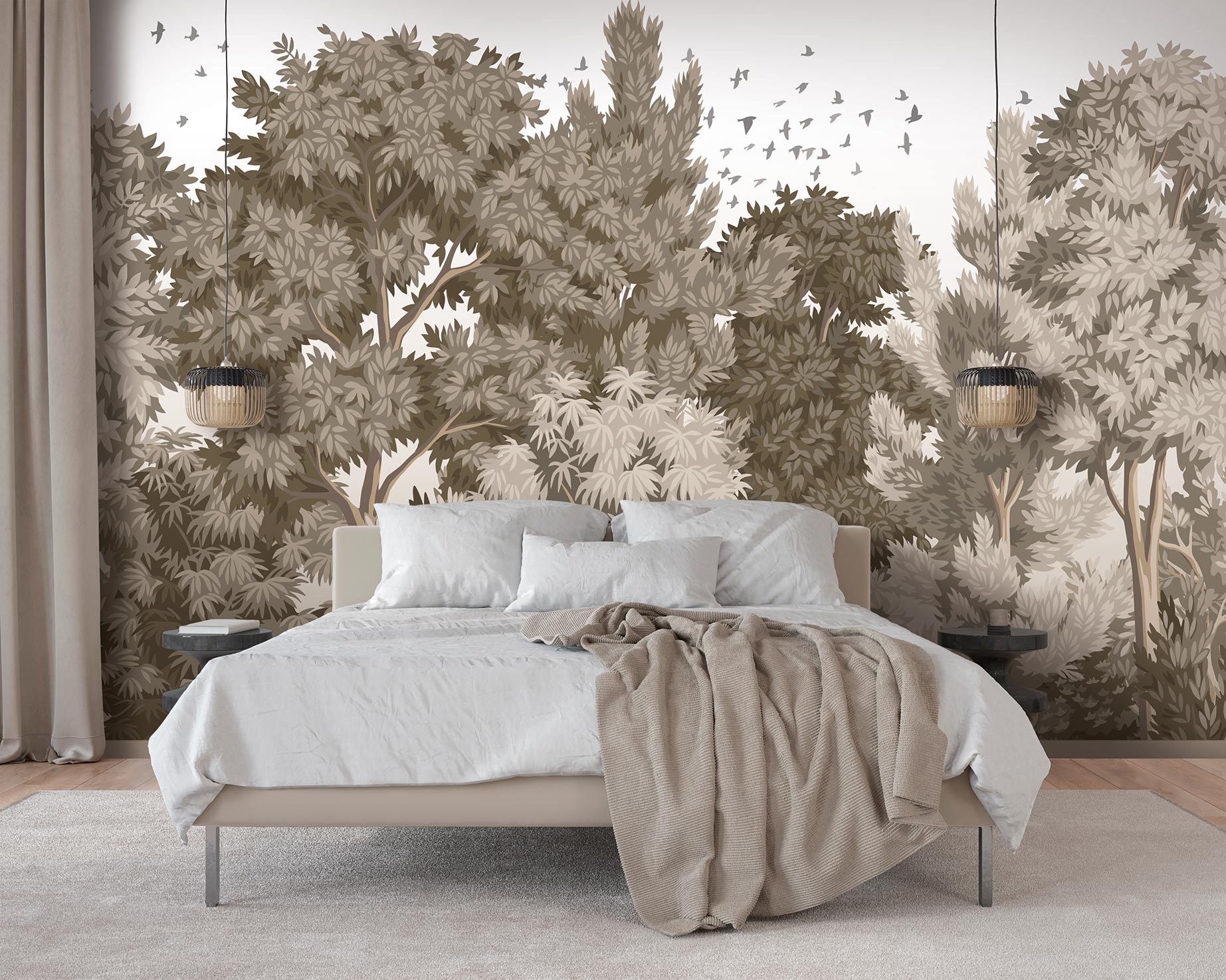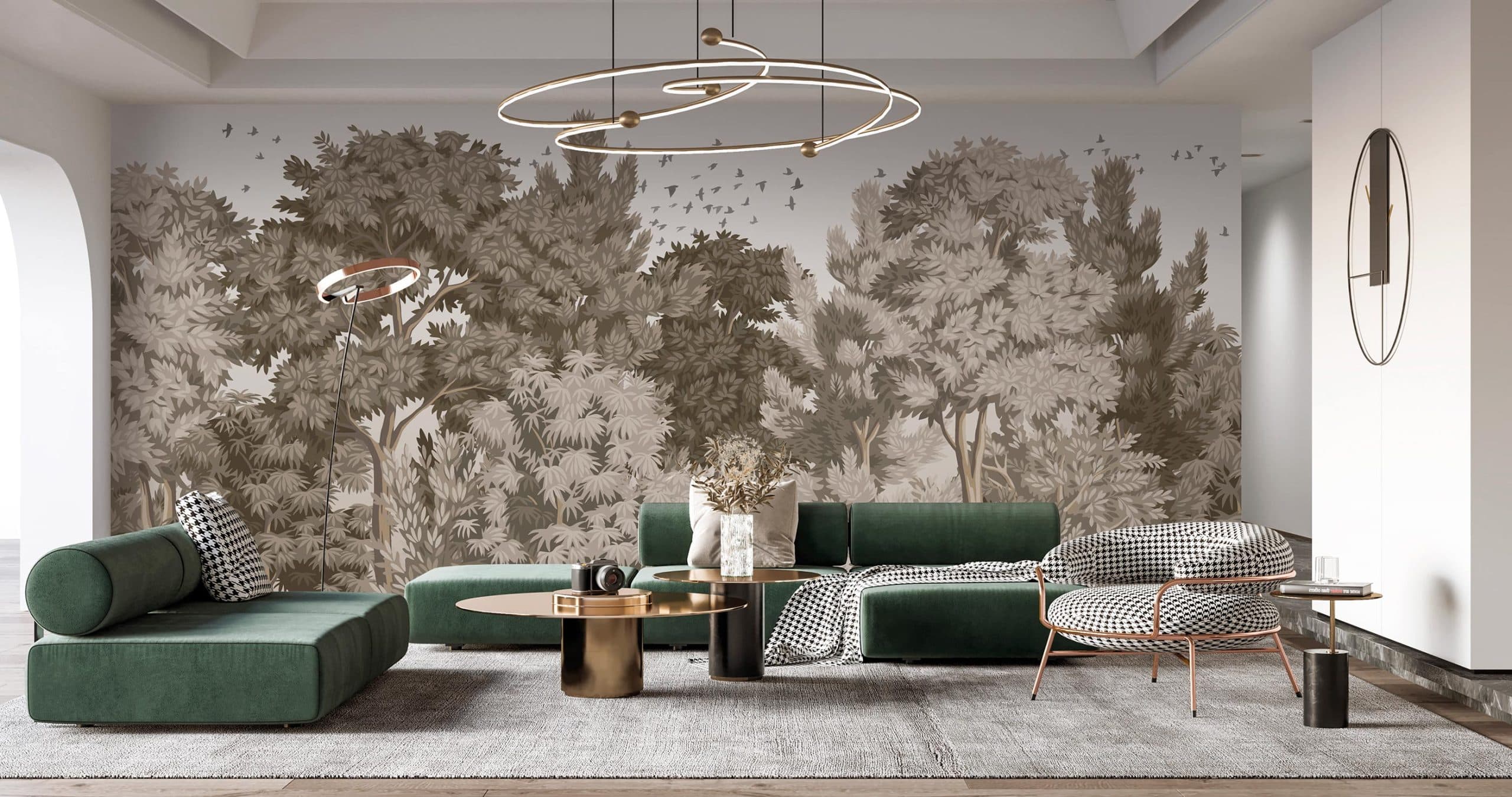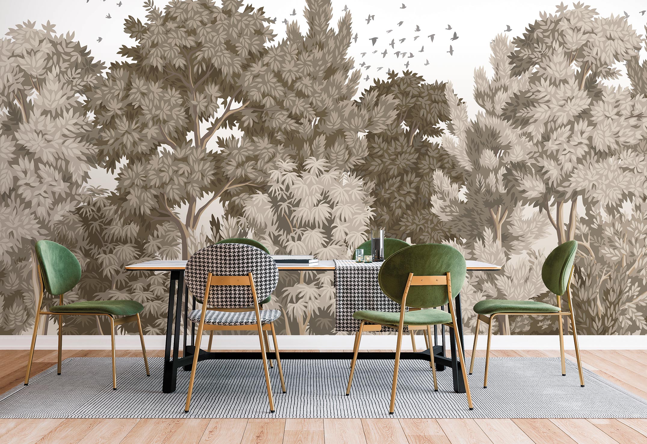 Le modèle de papier peint existe en trois versions colorées : une variation de vert, une variation de brun, et une dernière blanche et gris clair. On aime son dessin enveloppant. Les arbres et leurs feuilles deviennent un écrin pour l’intérieur.