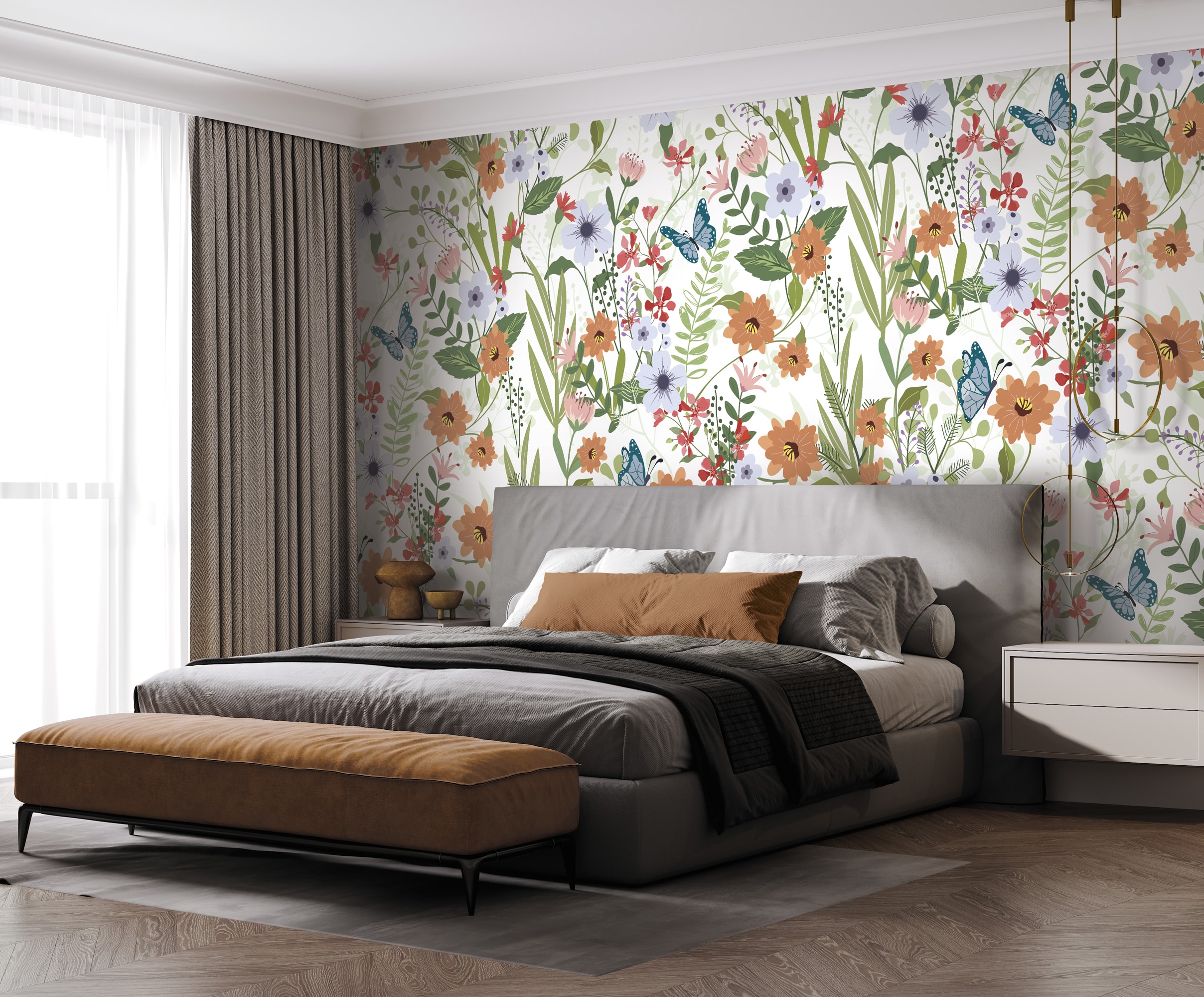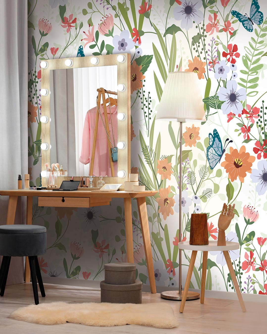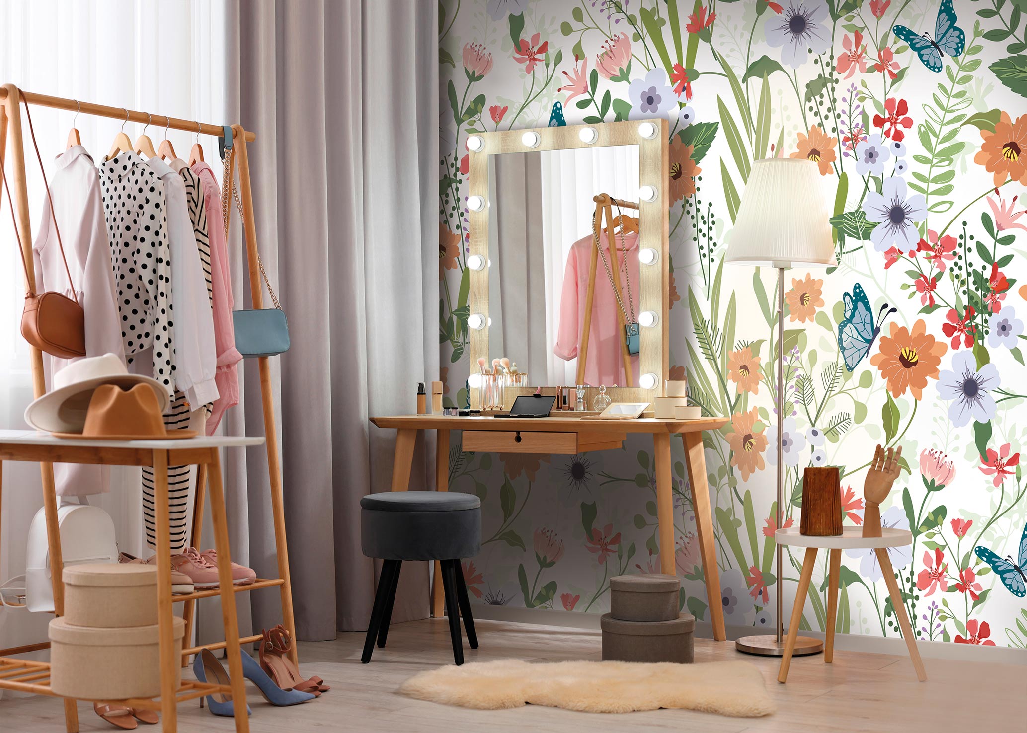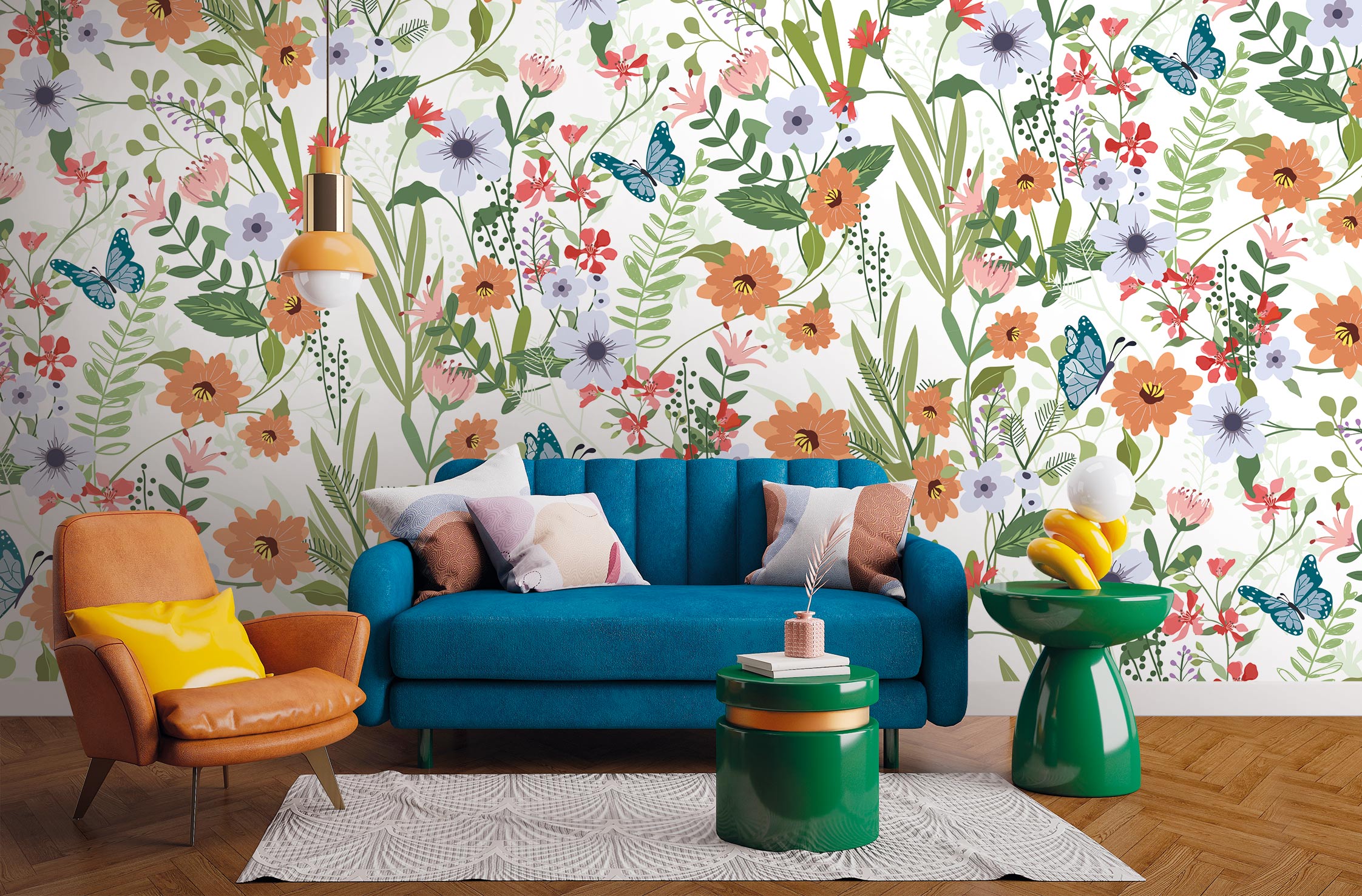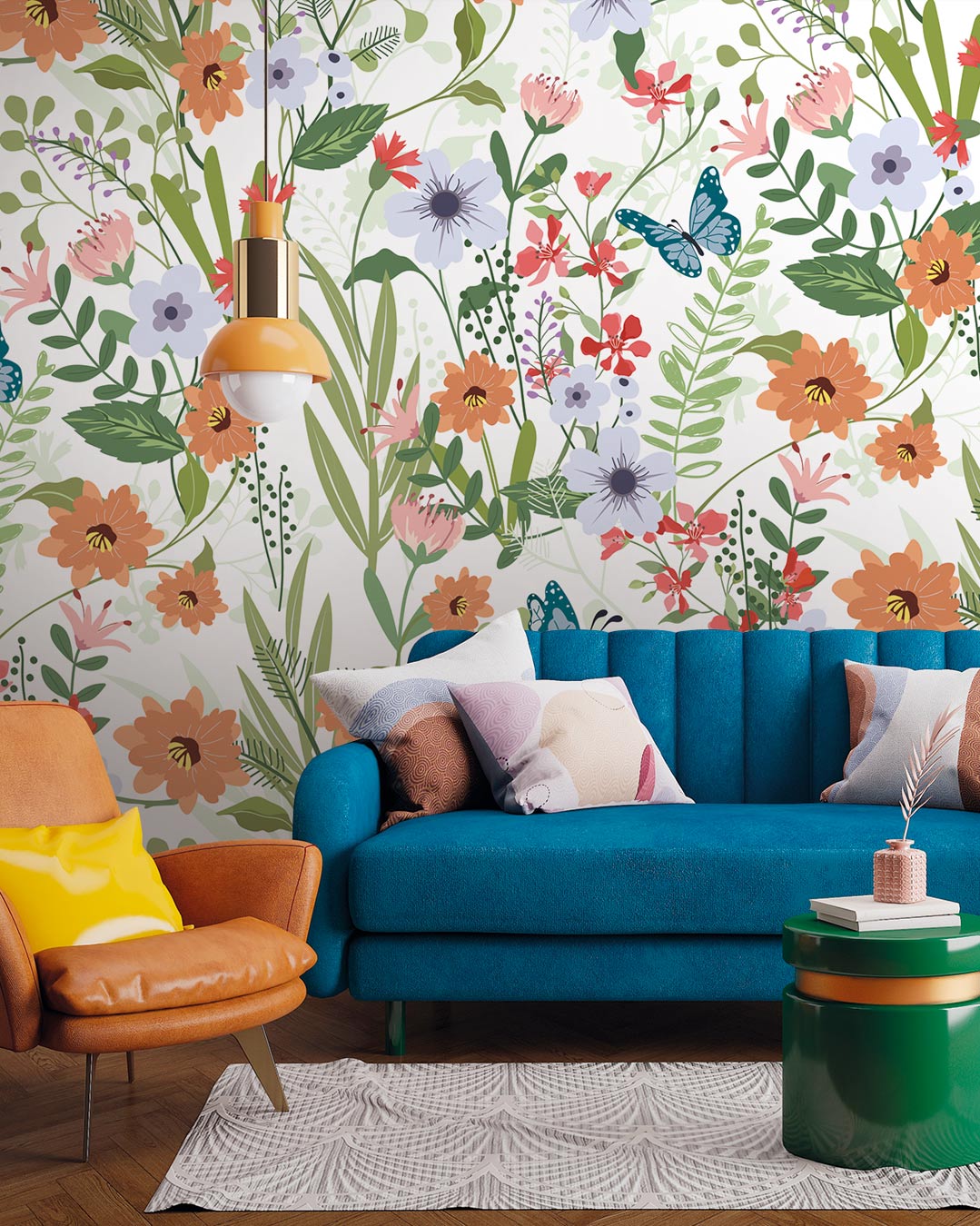 Le décor mural floral se décline en trois modèles : le premier sur fond blanc accueille des fleurs colorées ; le deuxième privilégie le vert, le jaune et le bleu ; le troisième sur fond vert affiche des fleurs blanches, rouge foncé et rose poudré. La troisième version de papier peint est la plus vintage, les contrastes de vert sont fondants et divins.