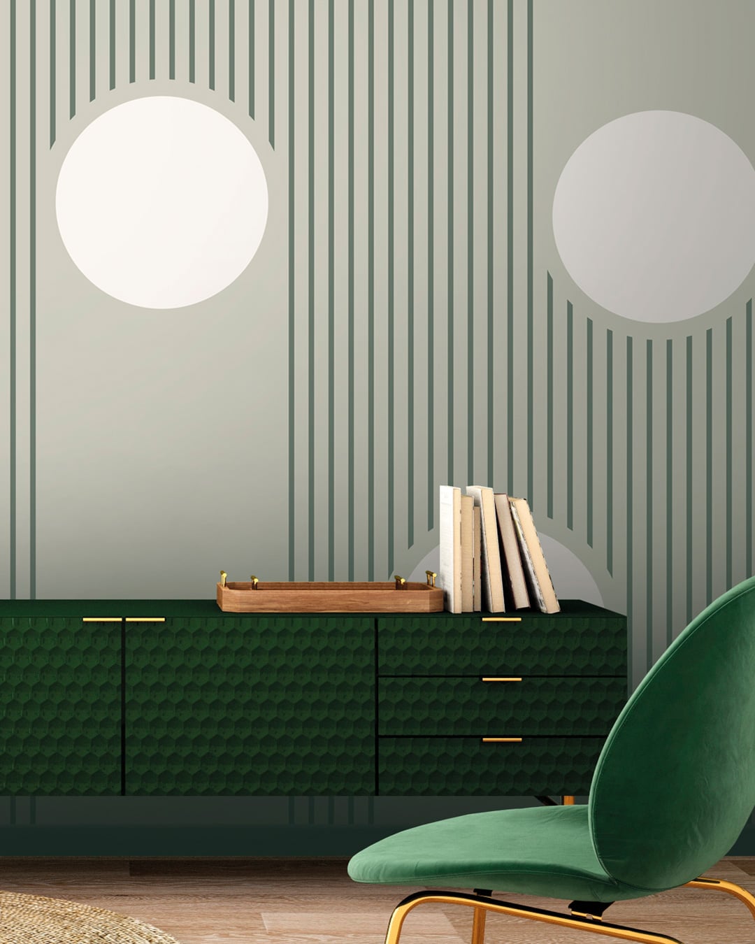 Le papier peint REGULA dessine sur un fond coloré très clair, des lignes verticales qui parcourent le décor mural, partant du haut ou du bas du papier peint. Elles s’arrêtent aux contours de ronds blancs en épousant leurs arrondis. Comme des suspensions lumineuses, ou des lampes sur pieds, les lignes et les cercles créent un décor mural géométrique. Le papier peint se décline en 3 modèles de duos colorés : vert clair et kaki, rose pâle et rose bonbon ou crème et beige. Chaque composition laisse la forme sphérique en blanc pour imiter un globe lumineux.