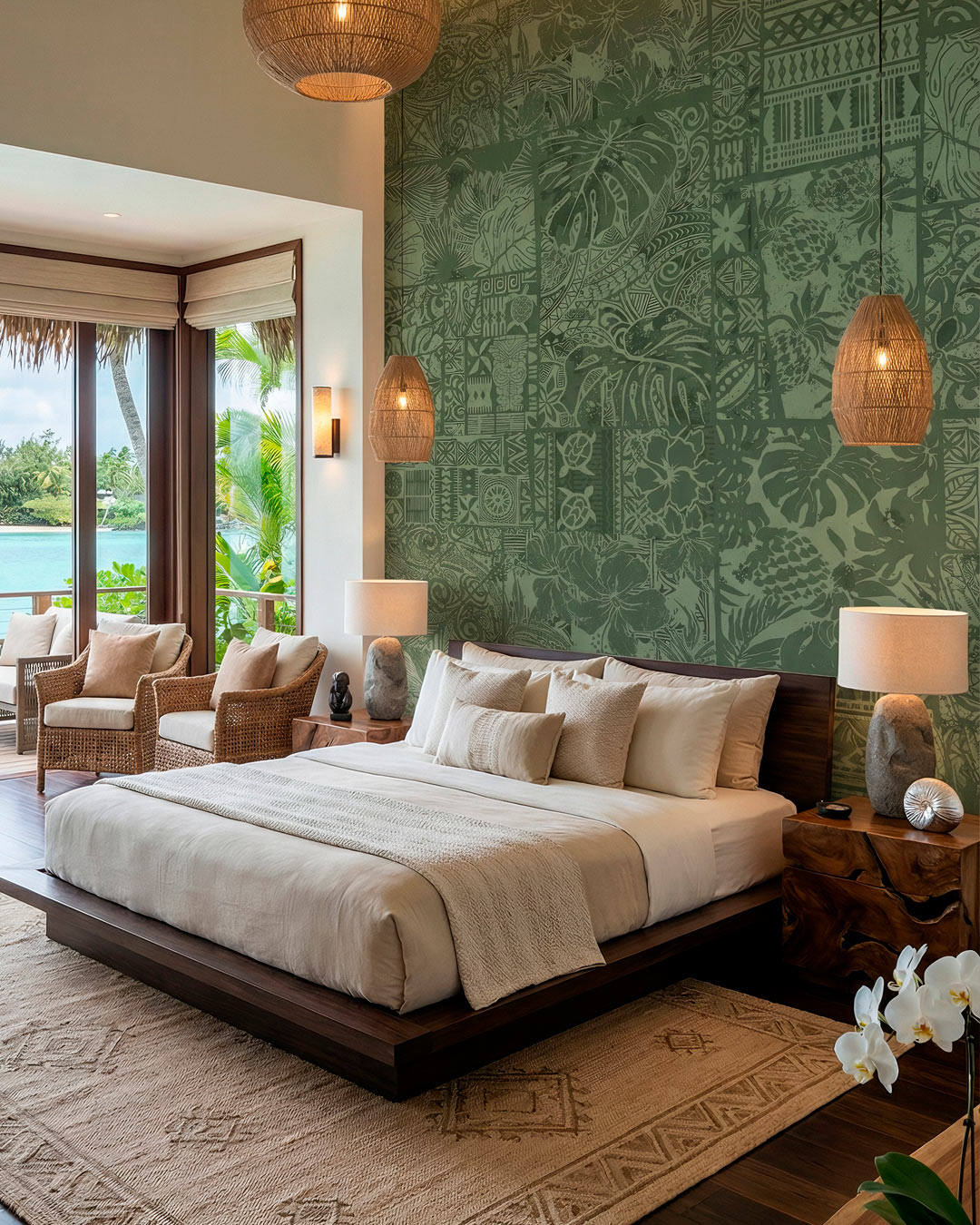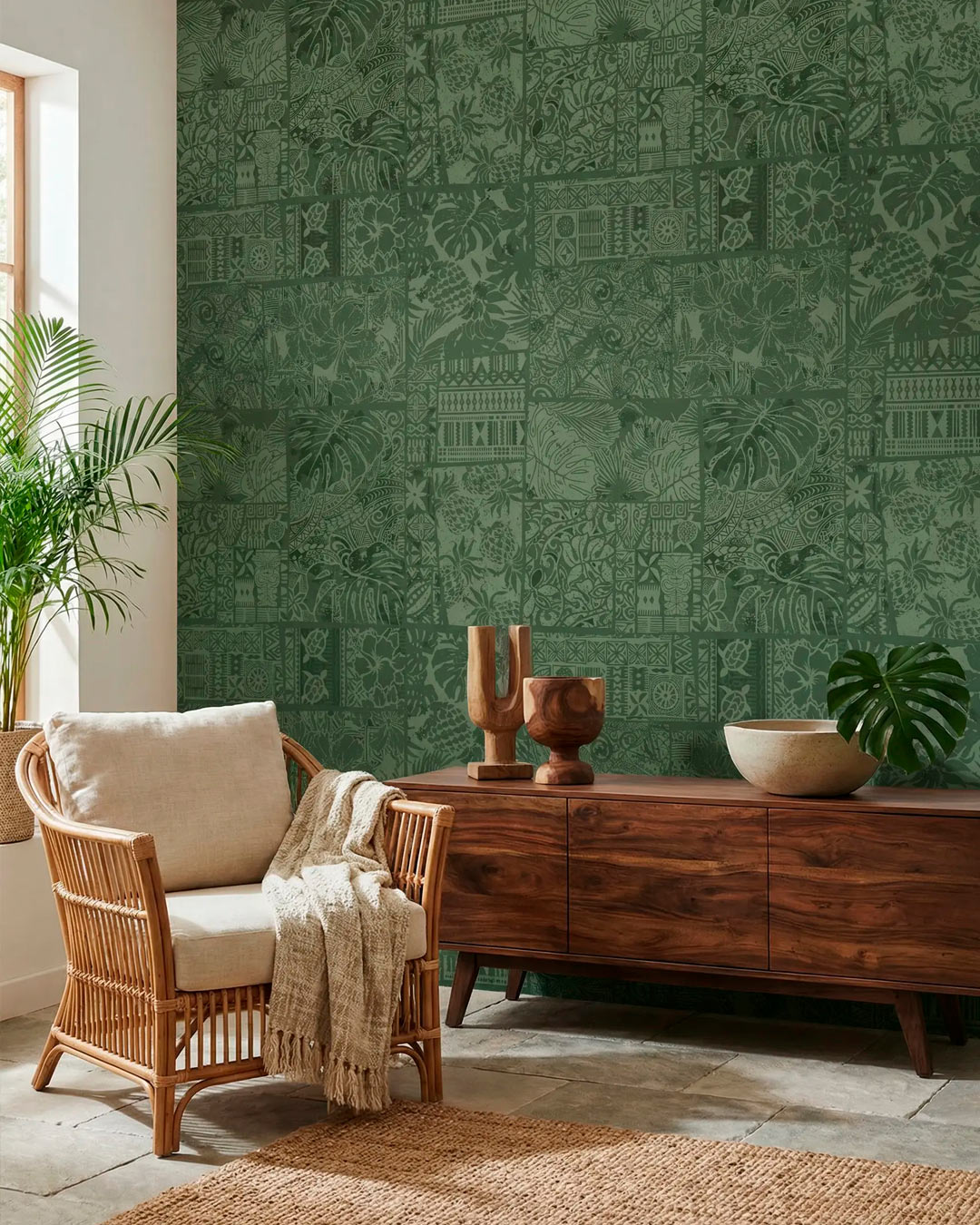 Ce patchwork reprend avec finesse les trésors de l’île : les belles fleurs et feuilles tropicales, les tortues exotiques, les ananas juteux et les symboles ethniques. Tous ces éléments sont représentés dans différents rectangles qui s’accumulent sur la tapisserie, comme un tapis que l’on aurait cousu à la main. La finesse des traits et la minutie des détails compensent la multitude des motifs du décor mural. Le papier peint est gracieux et léger. Sur fond blanc, beige ou vert, il crée une ambiance tropicale avec une élégance rare.