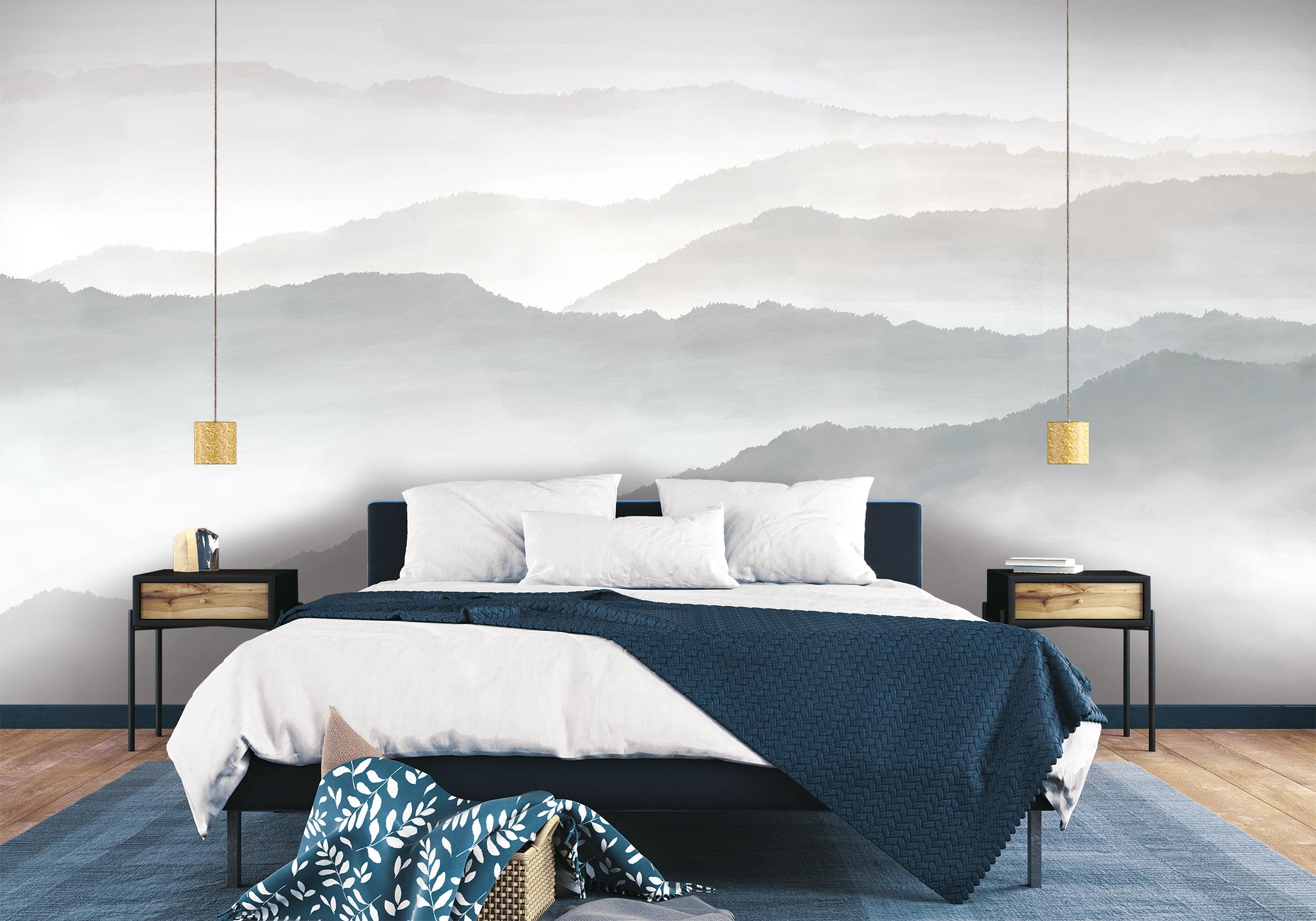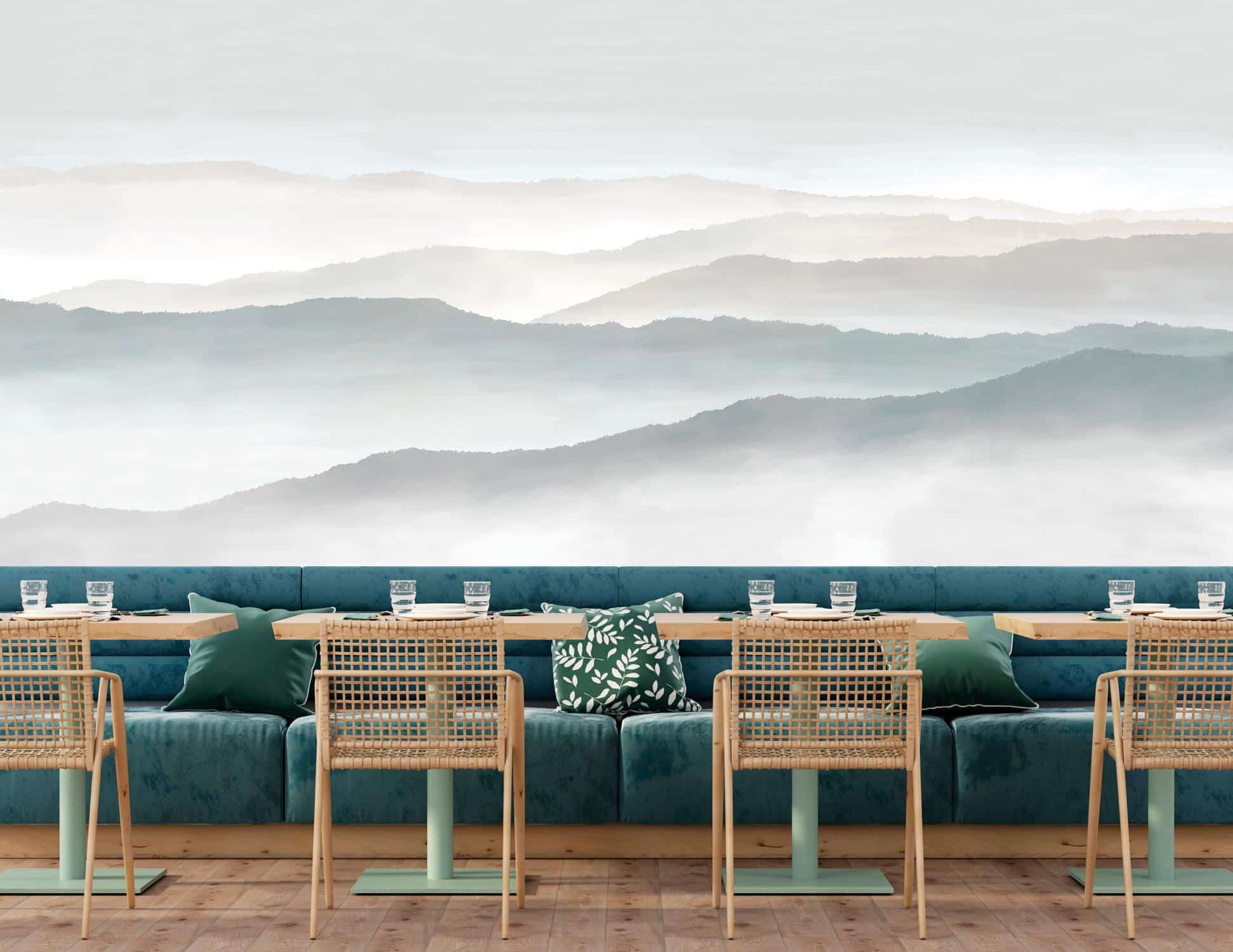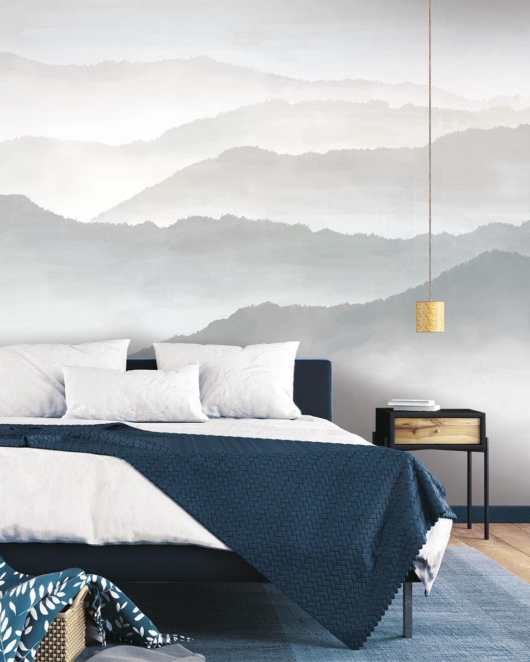 Le papier peint LEISURE propose une vue imprenable sur les montagnes. Il nous place en hauteur, face à l’horizon. Les sommets arrondis se découpent en douceur sur la tapisserie dans des dégradés de couleurs délavées (beige, brun, vert, gris). Un ciel bleu pâle et couvert de nuages se distingue à peine. Le décor mural s’enveloppe d’un voile de brume pour nous enrober d’une douceur apaisante.