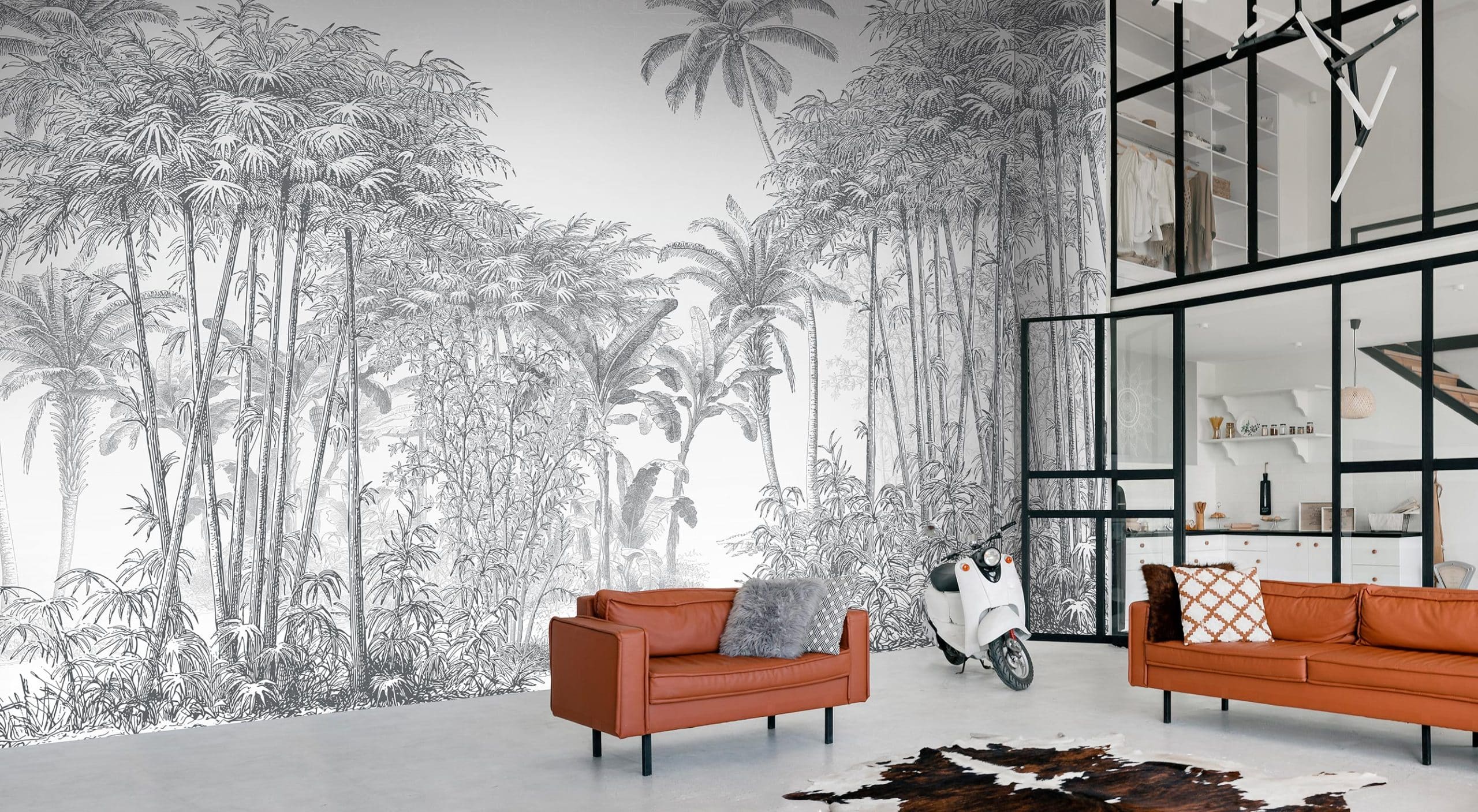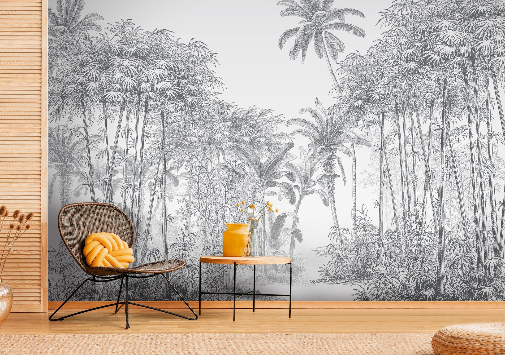 Le papier peint MANAUS présente une forêt tropicale en noir et blanc, elle semble avoir été réalisée au crayon de papier. Le décor mural fait penser à l’illustration d’un livre ou au dessin d’un carnet de voyage. La végétation est composée de palmiers, de cocotiers, d’arbustes et de plantes exotiques, dessinés avec précision et légèreté. La jungle se couvre d’un ciel gris dégagé très pâle. Au milieu de la tapisserie, la végétation crée un passage qui ouvre sur une plaine.