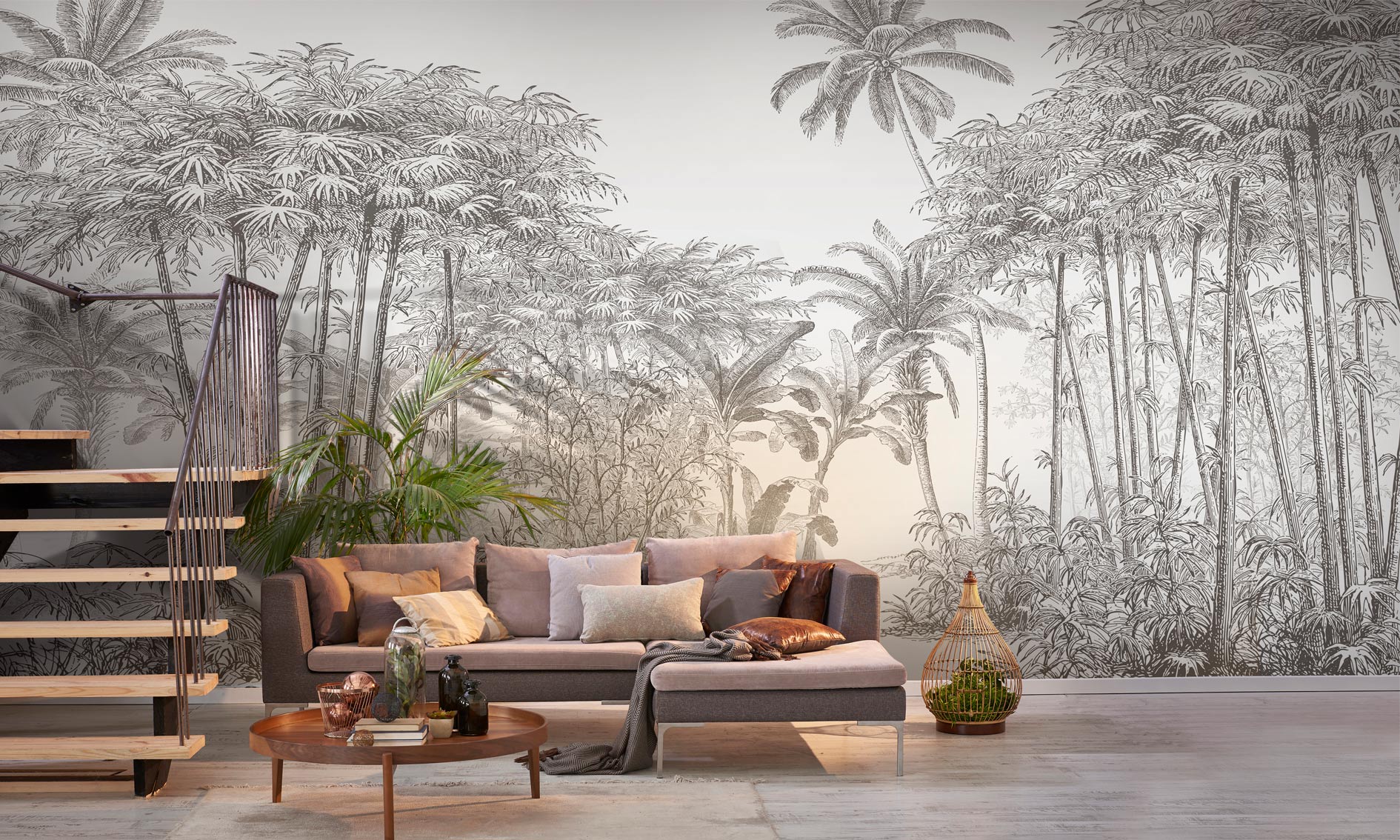 La jungle n’a rien d’hostile, au contraire. Le papier peint Manaus offre un paysage tropical subtil et délicat.