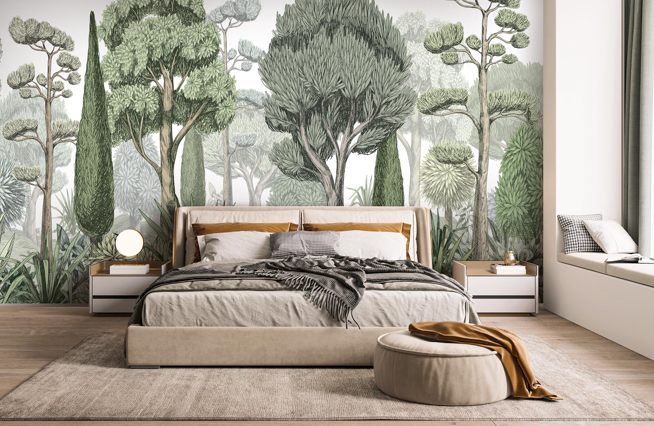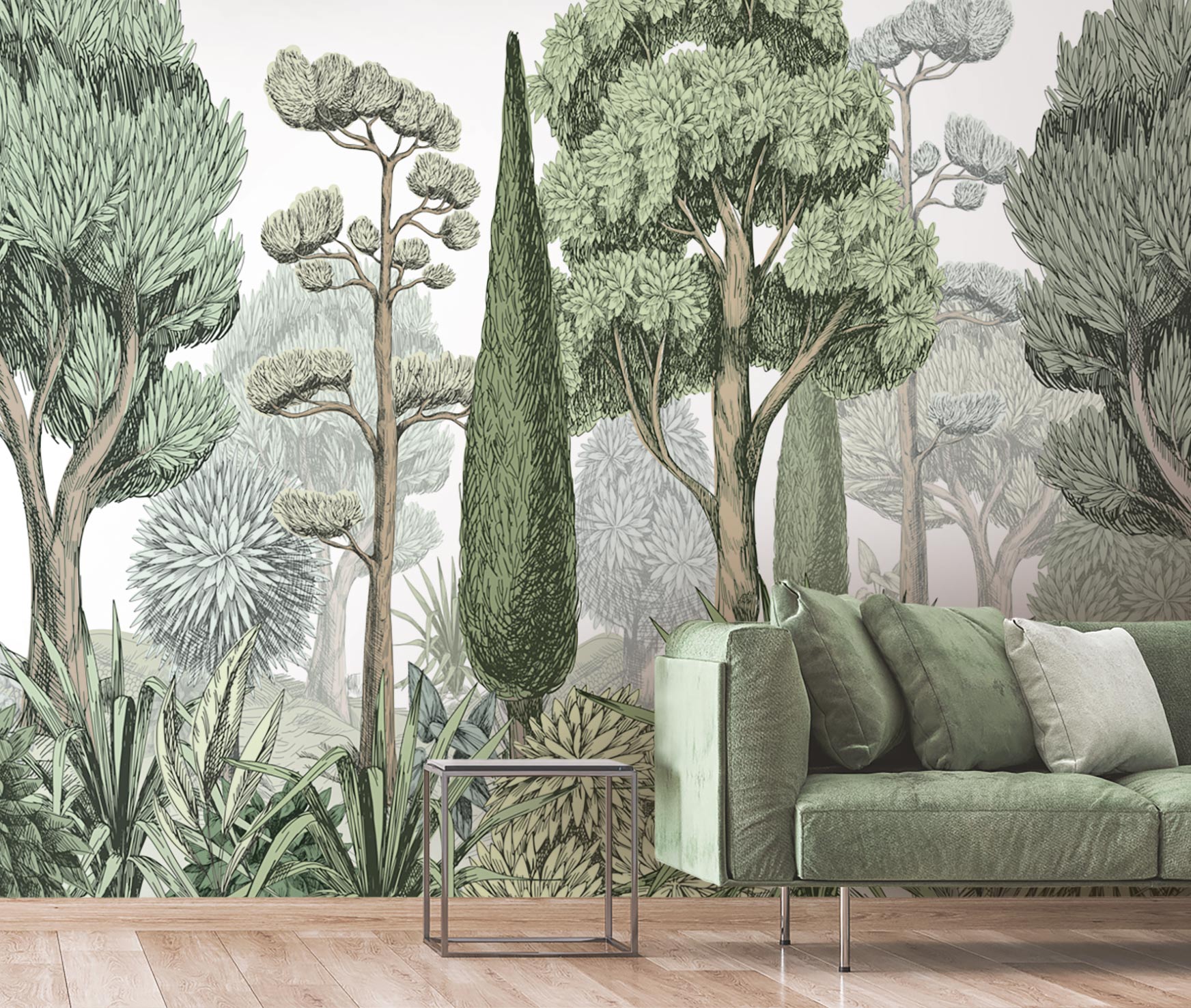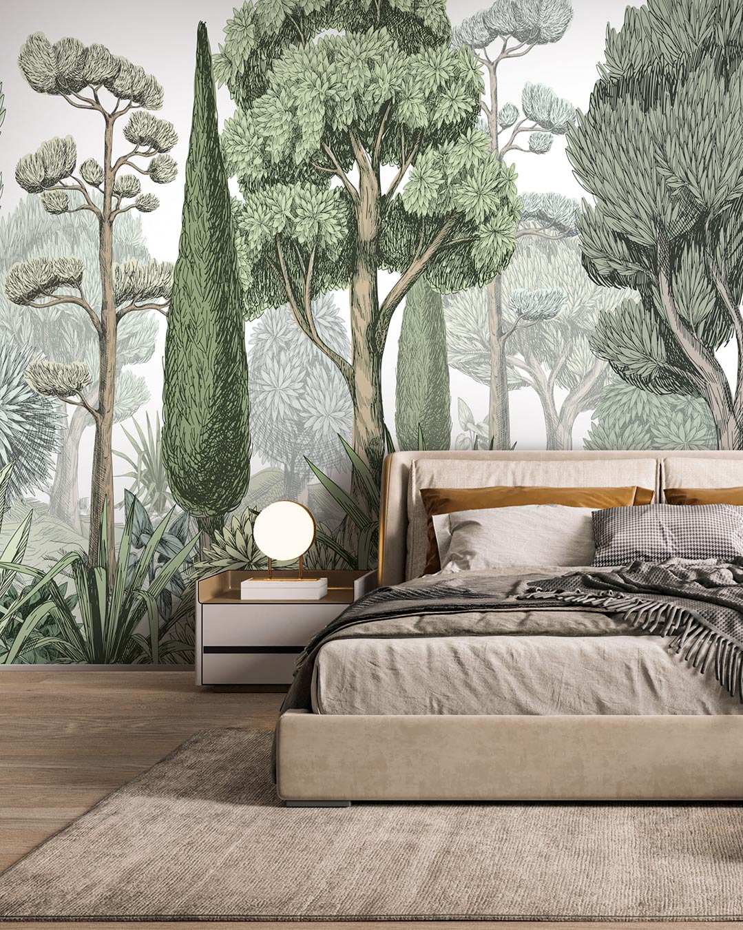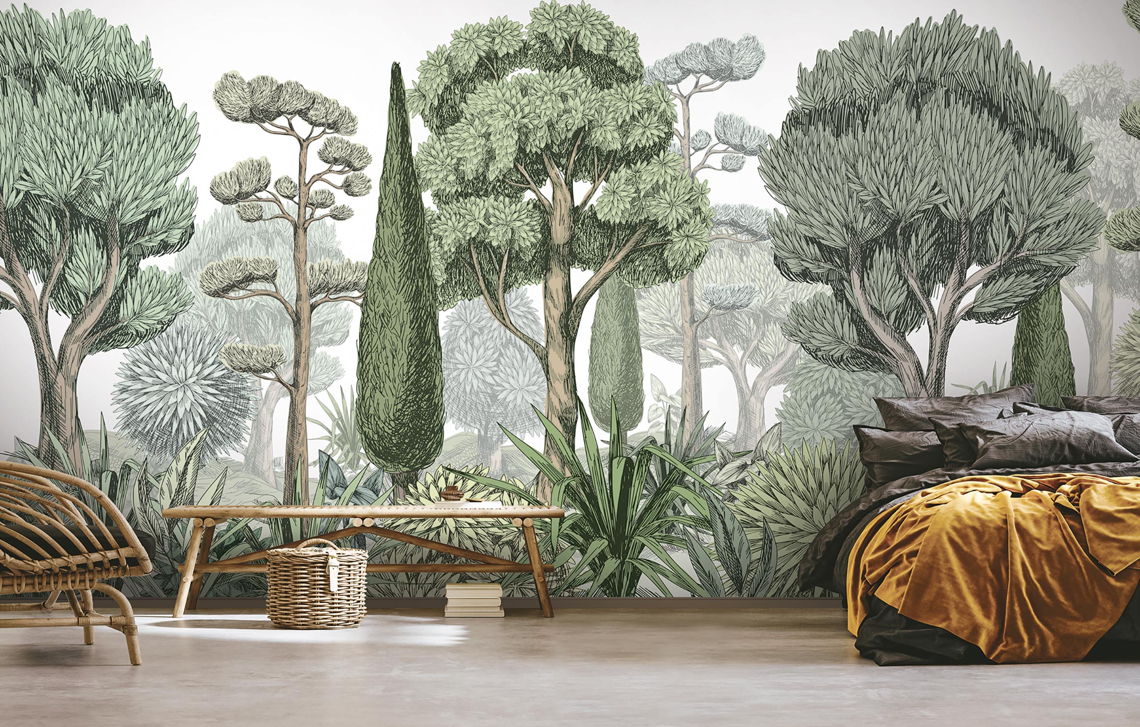 Le papier peint célèbre la végétation du sud : pins, pins parasols, cyprès, arbousiers… Sous forme de dessin, la tapisserie se décline en trois versions (en couleurs, en noir et blanc, en gris pâle et blanc), allant du style le plus marqué au plus discret.