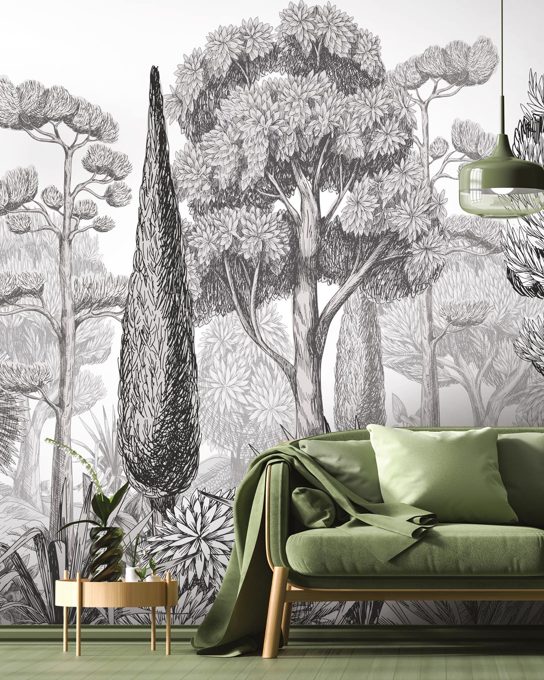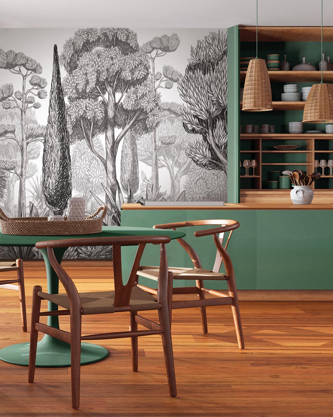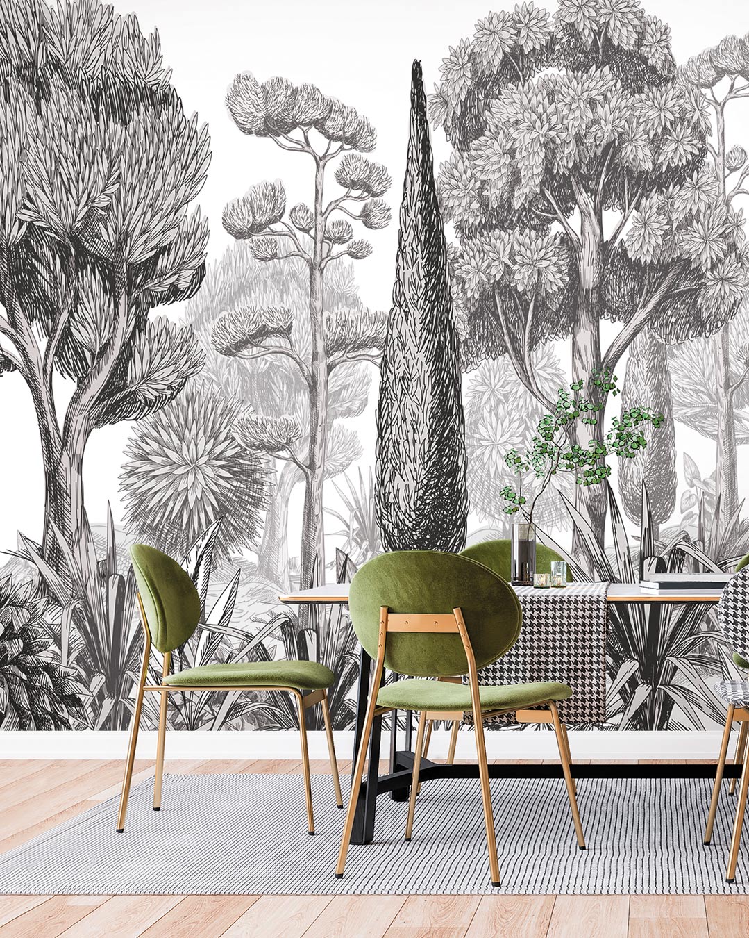 Le papier peint célèbre la végétation du sud : pins, pins parasols, cyprès, arbousiers… Sous forme de dessin, la tapisserie se décline en trois versions (en couleurs, en noir et blanc, en gris pâle et blanc), allant du style le plus marqué au plus discret.