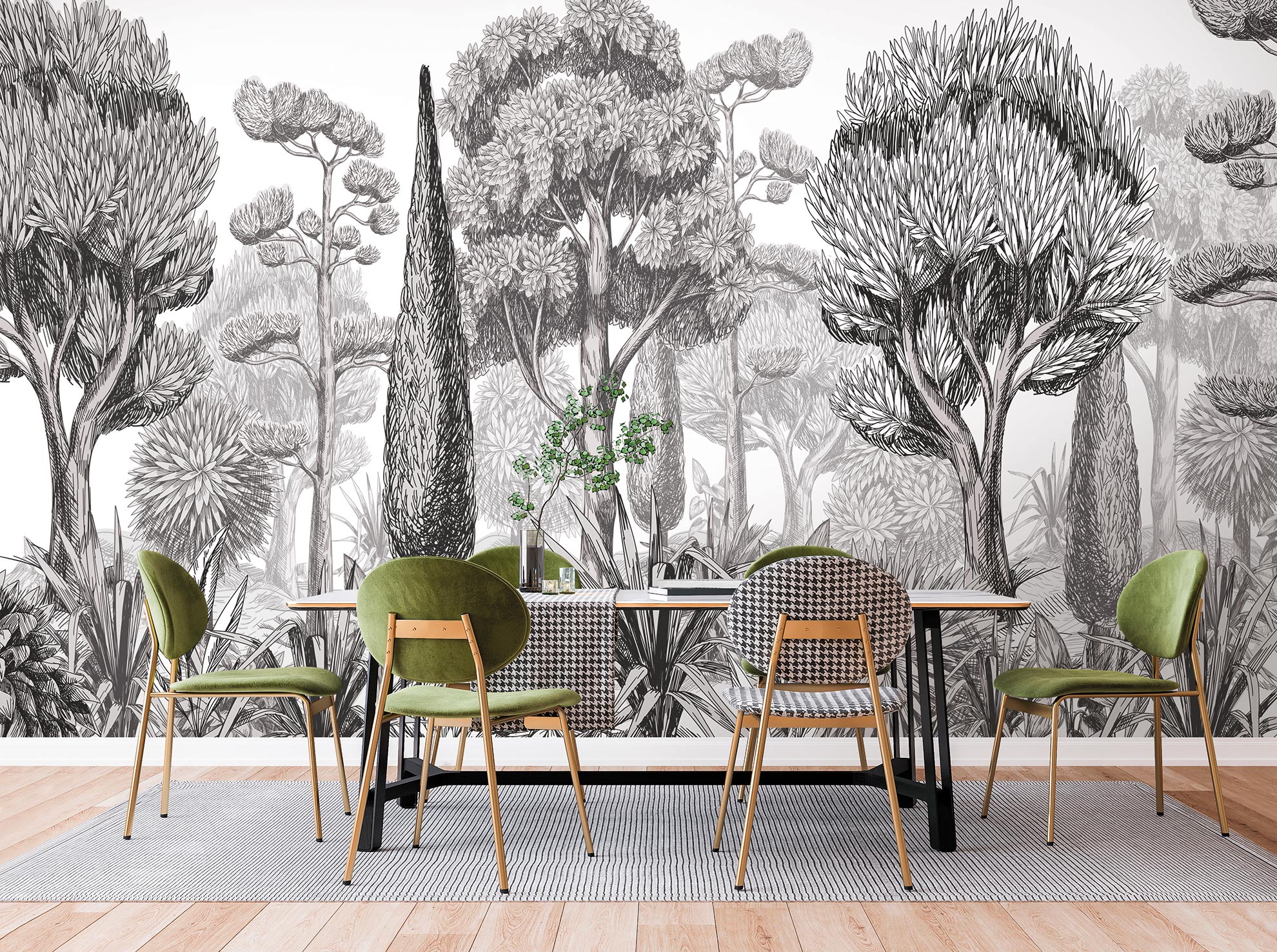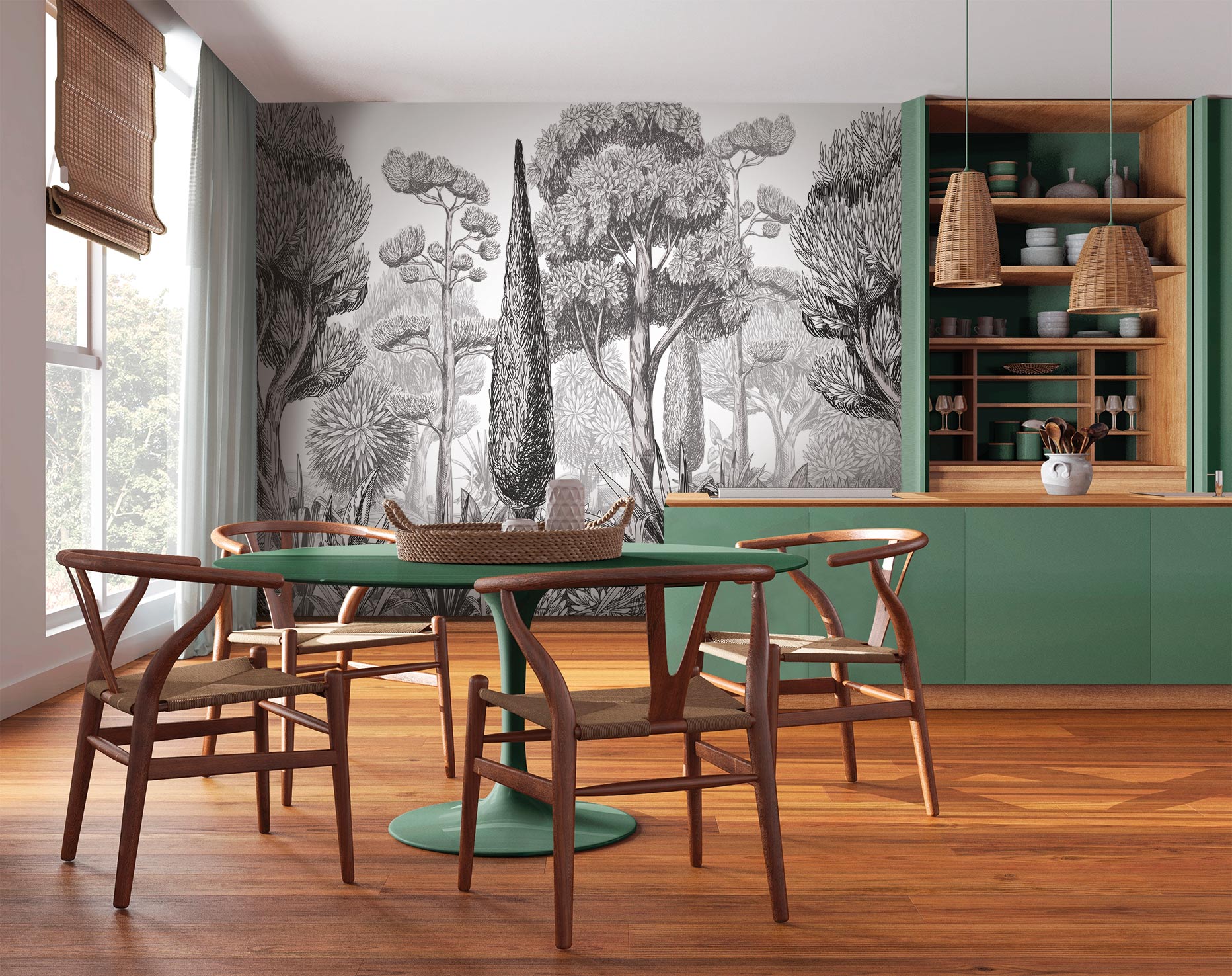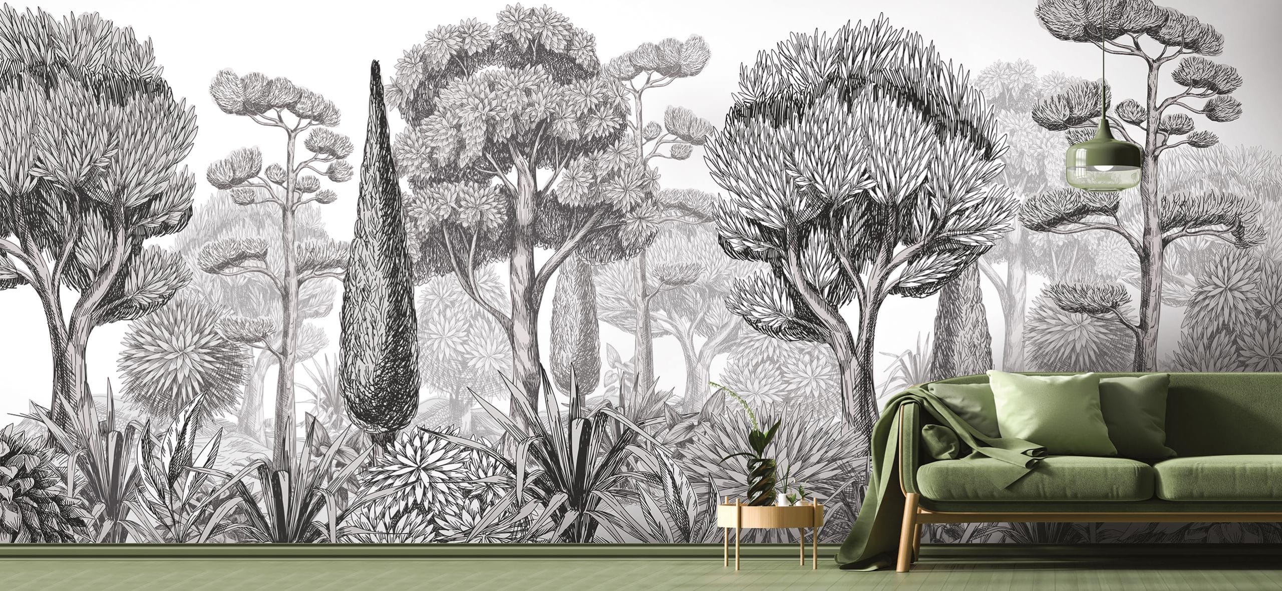 Le papier peint célèbre la végétation du sud : pins, pins parasols, cyprès, arbousiers… Sous forme de dessin, la tapisserie se décline en trois versions (en couleurs, en noir et blanc, en gris pâle et blanc), allant du style le plus marqué au plus discret.