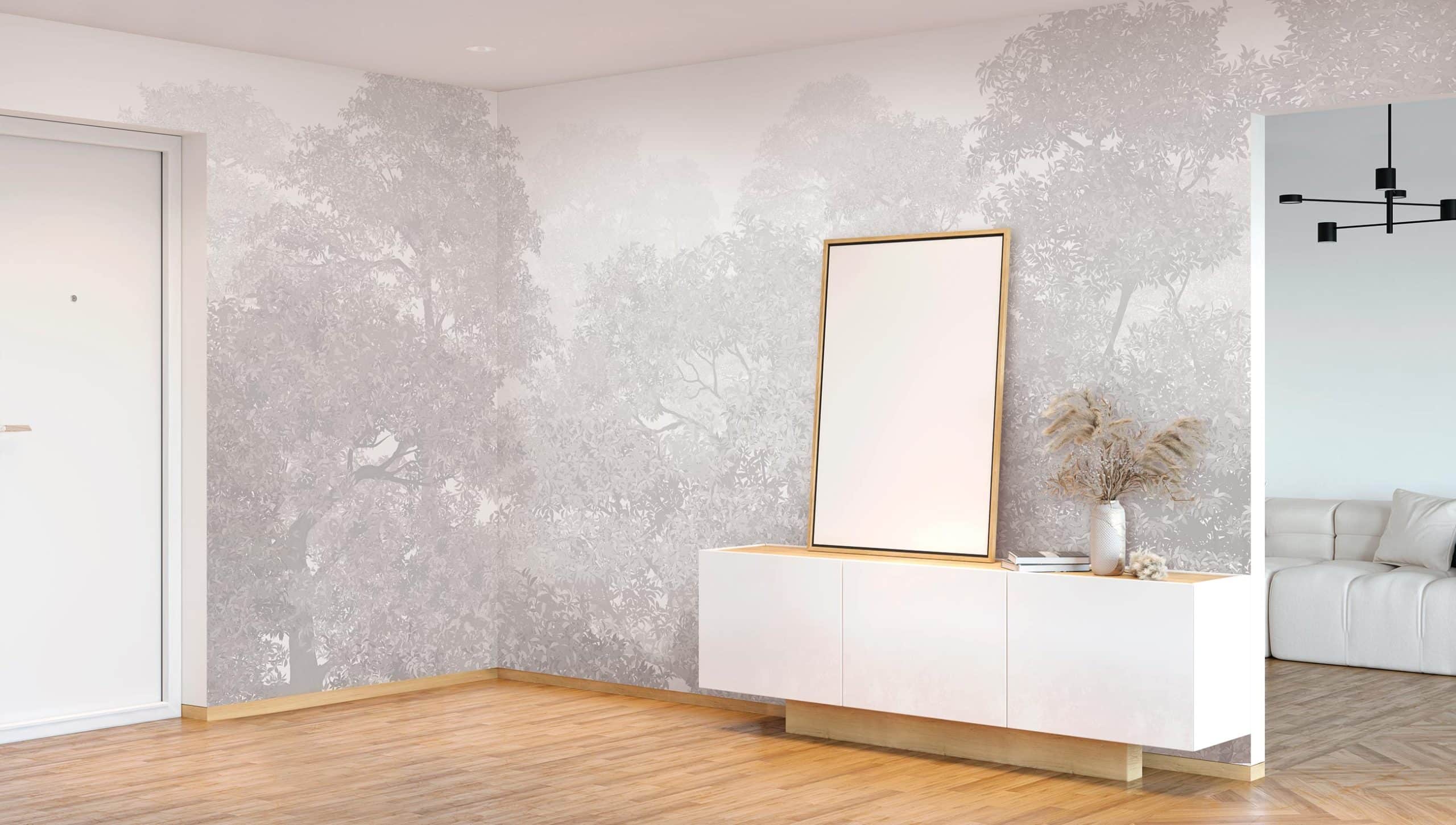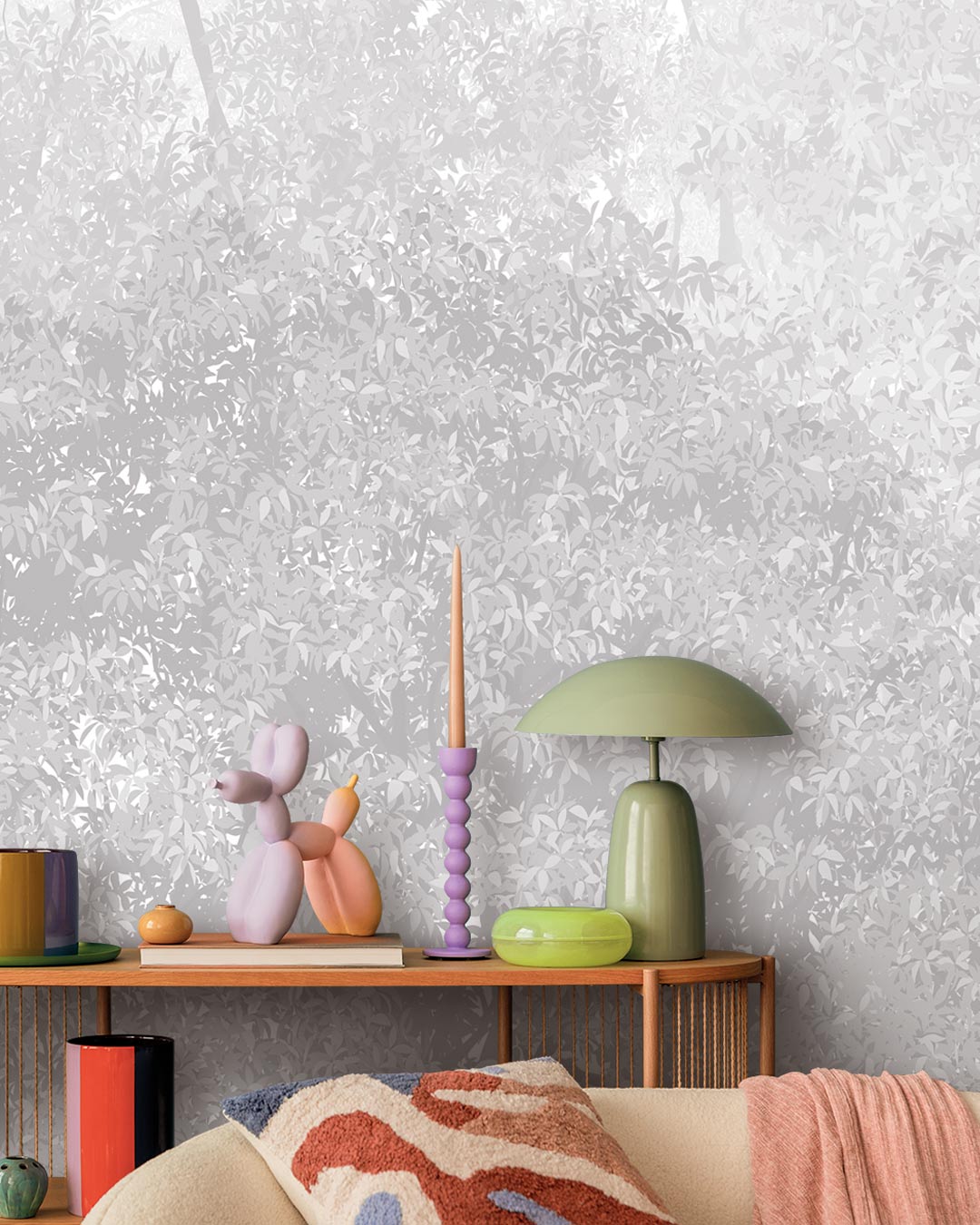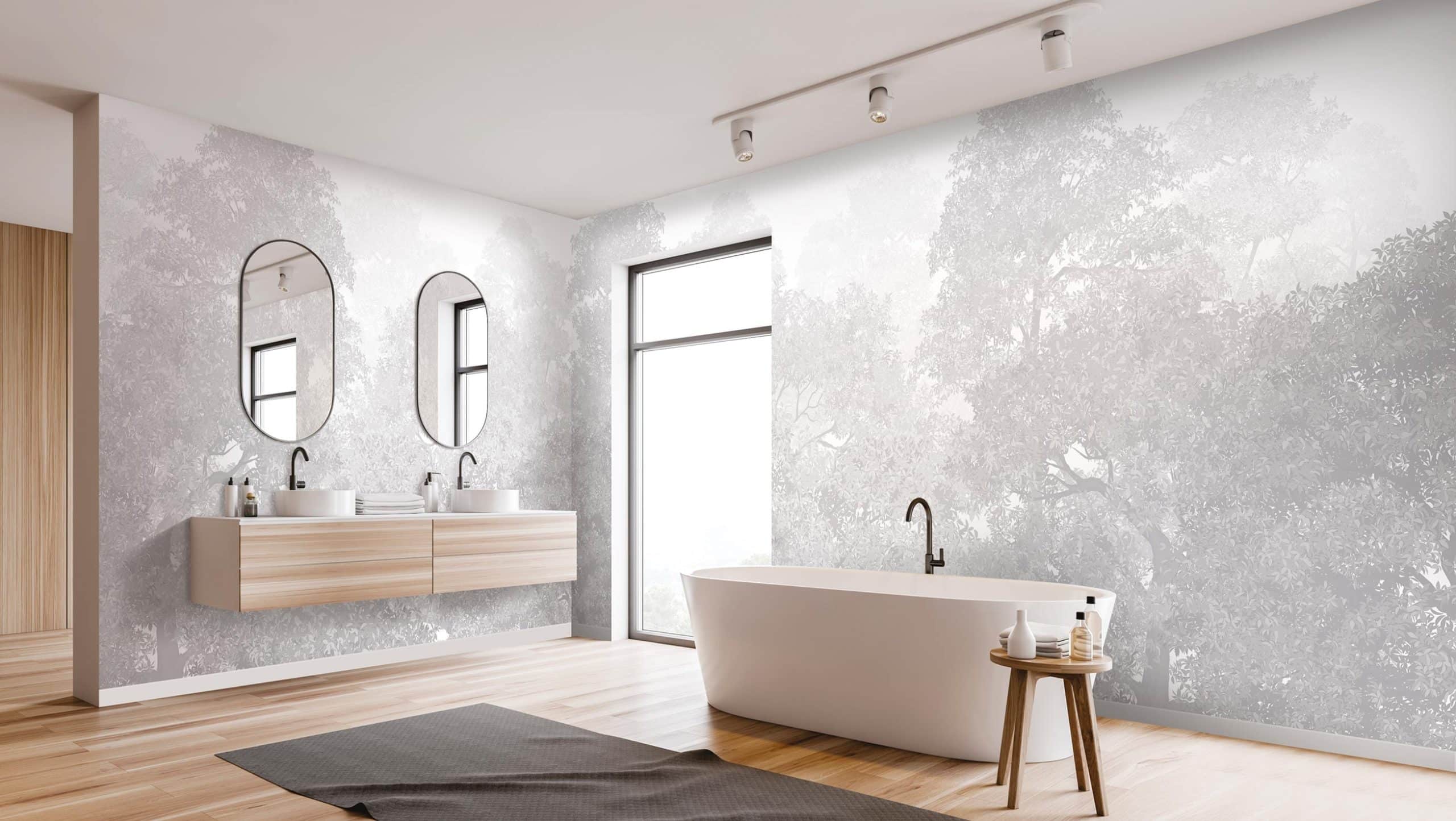 Le décor mural se décline en 2 modèles : gris et blanc ou avec un filtre couleur verveine.