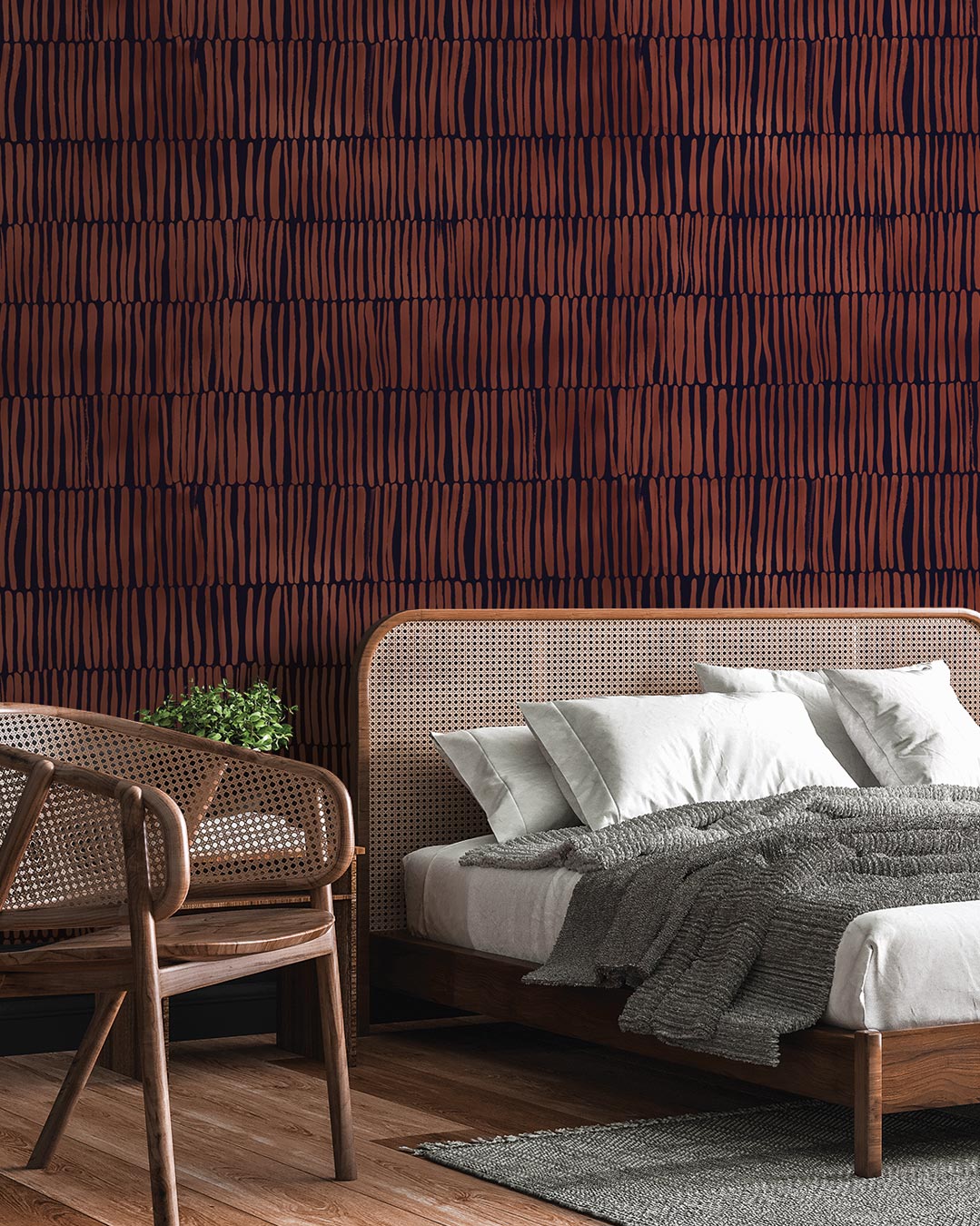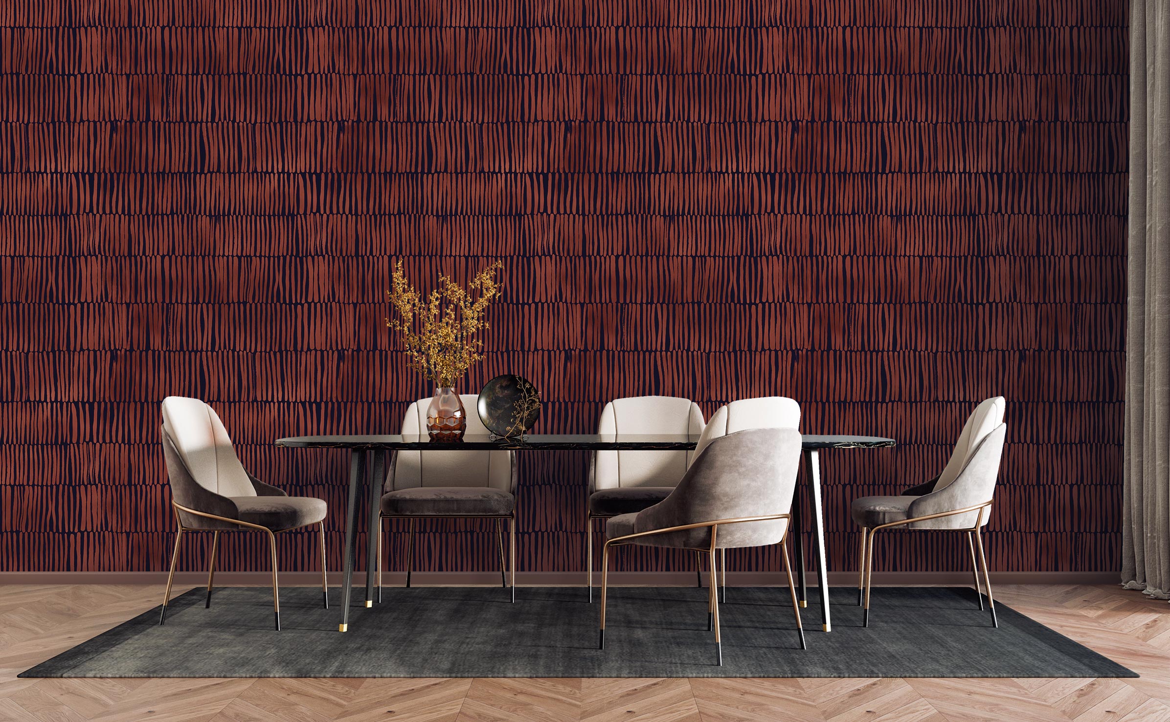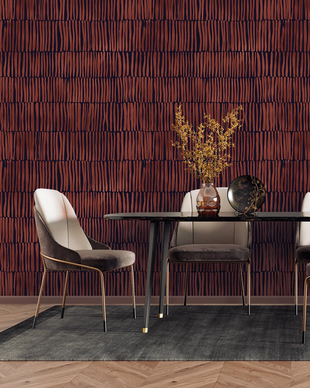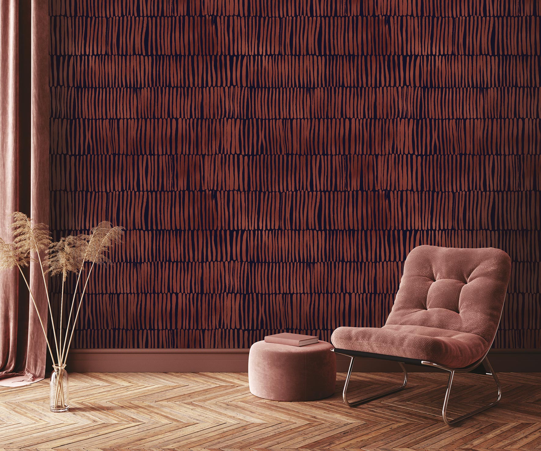 Plusieurs séries de lignes verticales sont disposées les unes sur les autres. Les lignes ne sont pas droites sur le décor mural, elles fluctuent comme s’il s’agissait d’un matériau naturel : du bois ou des bambous. La tapisserie peut s’inscrire dans un style ethnique.