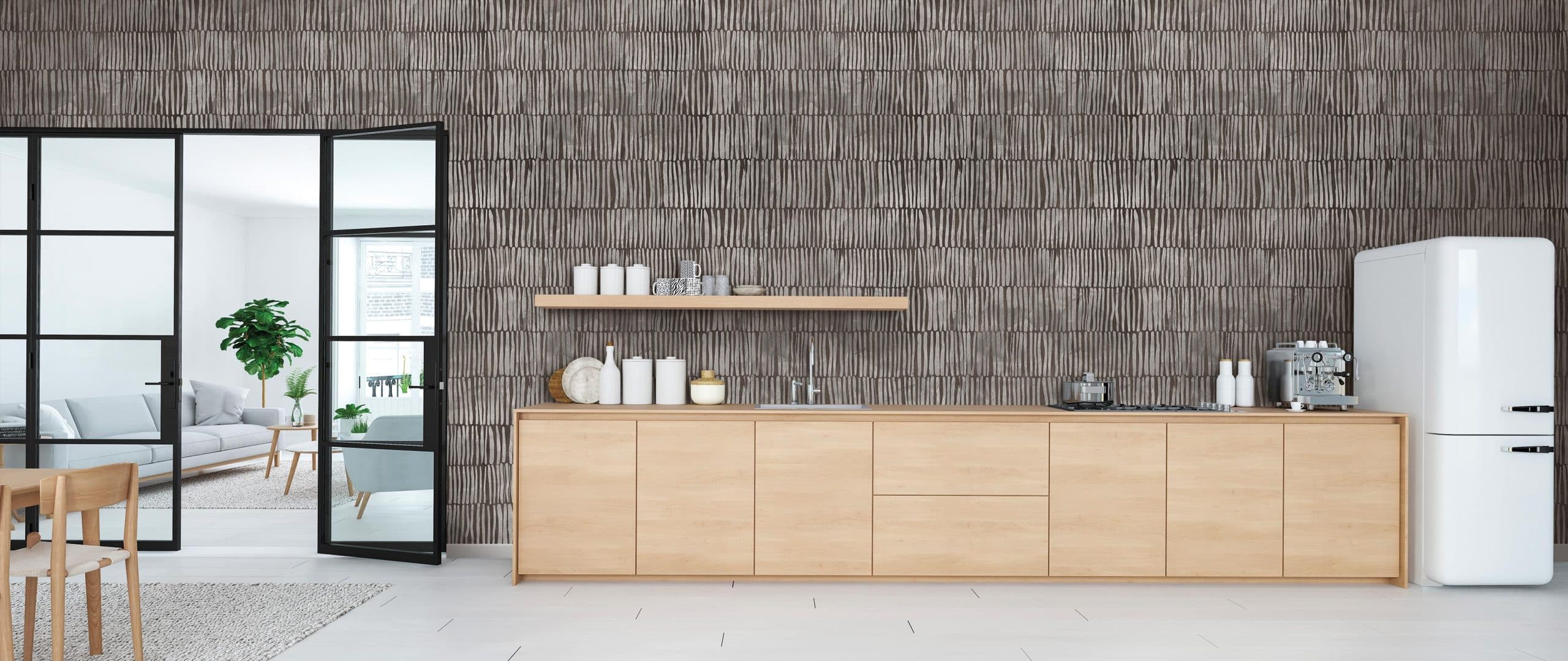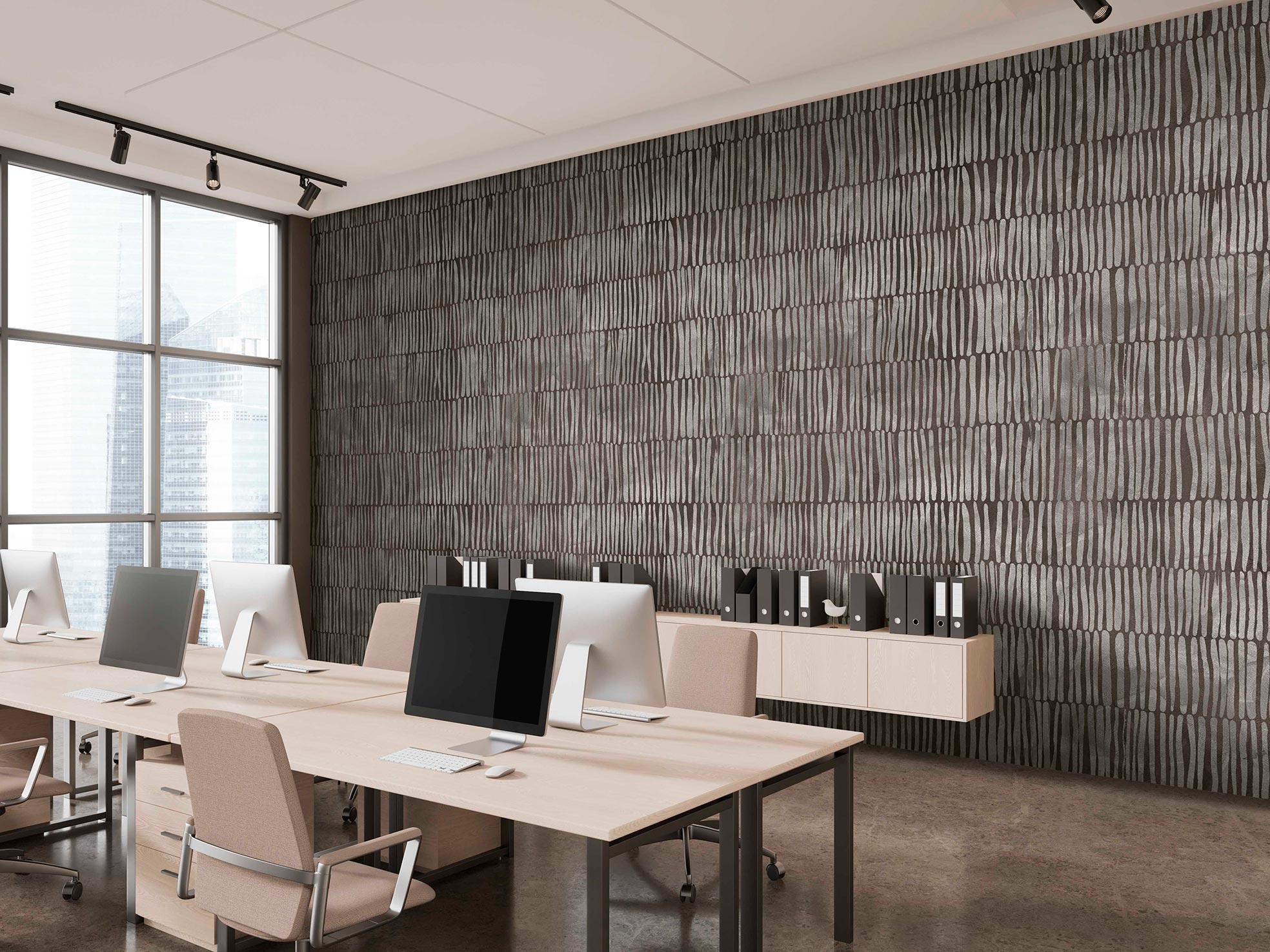 Plusieurs séries de lignes verticales sont disposées les unes sur les autres. Les lignes ne sont pas droites sur le décor mural, elles fluctuent comme s’il s’agissait d’un matériau naturel : du bois ou des bambous. La tapisserie peut s’inscrire dans un style ethnique.
