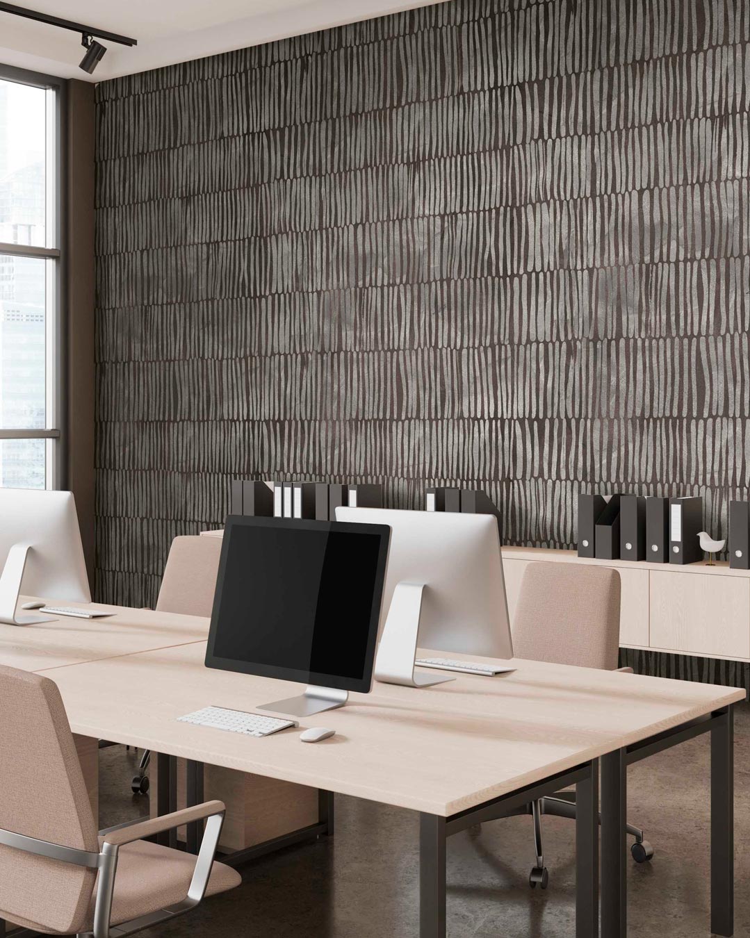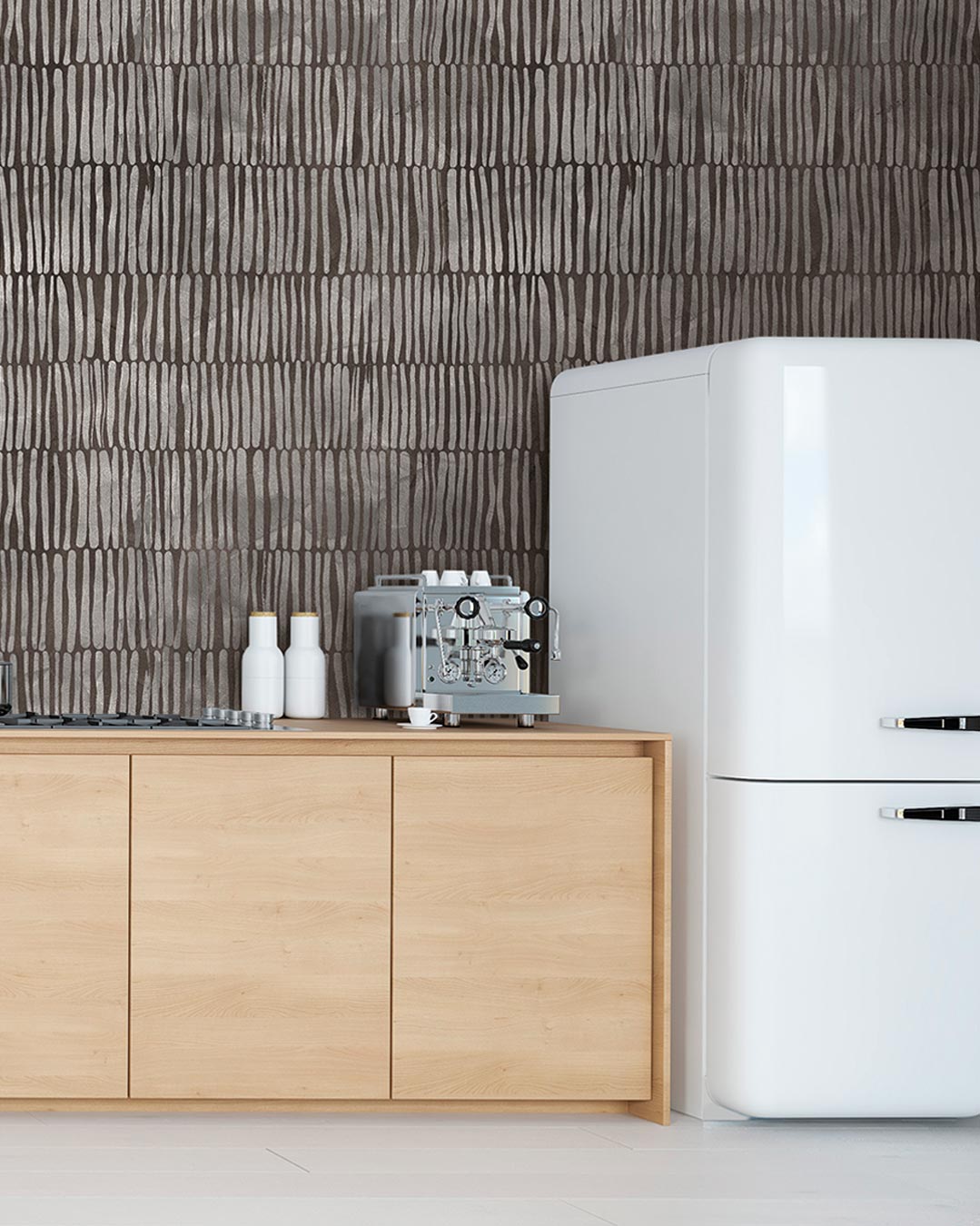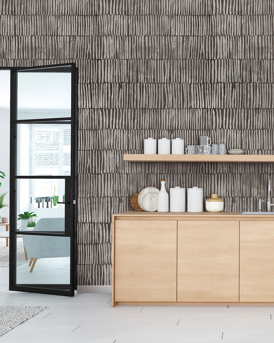 Le papier peint aux petites lignes imparfaites mais charmantes se décline en 4 duos de couleurs : fond bleu ou vert et traits blancs, fond brun et traits gris, fond noir et traits marron.