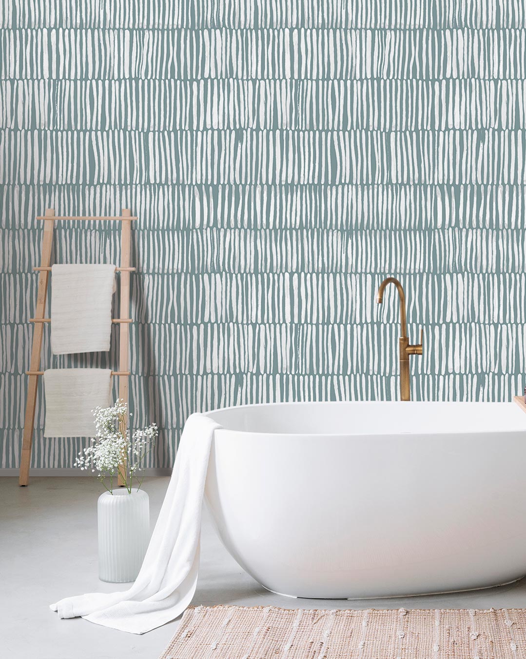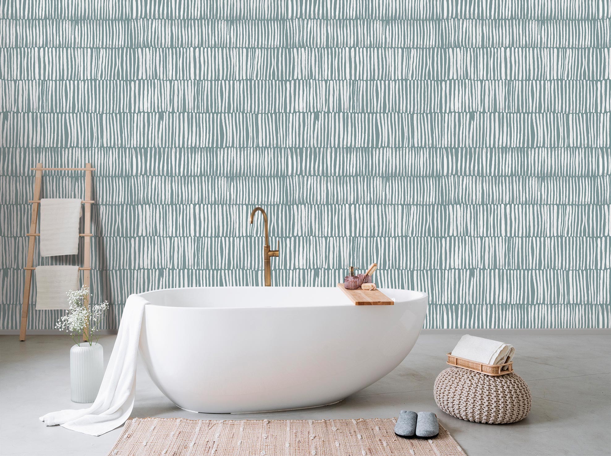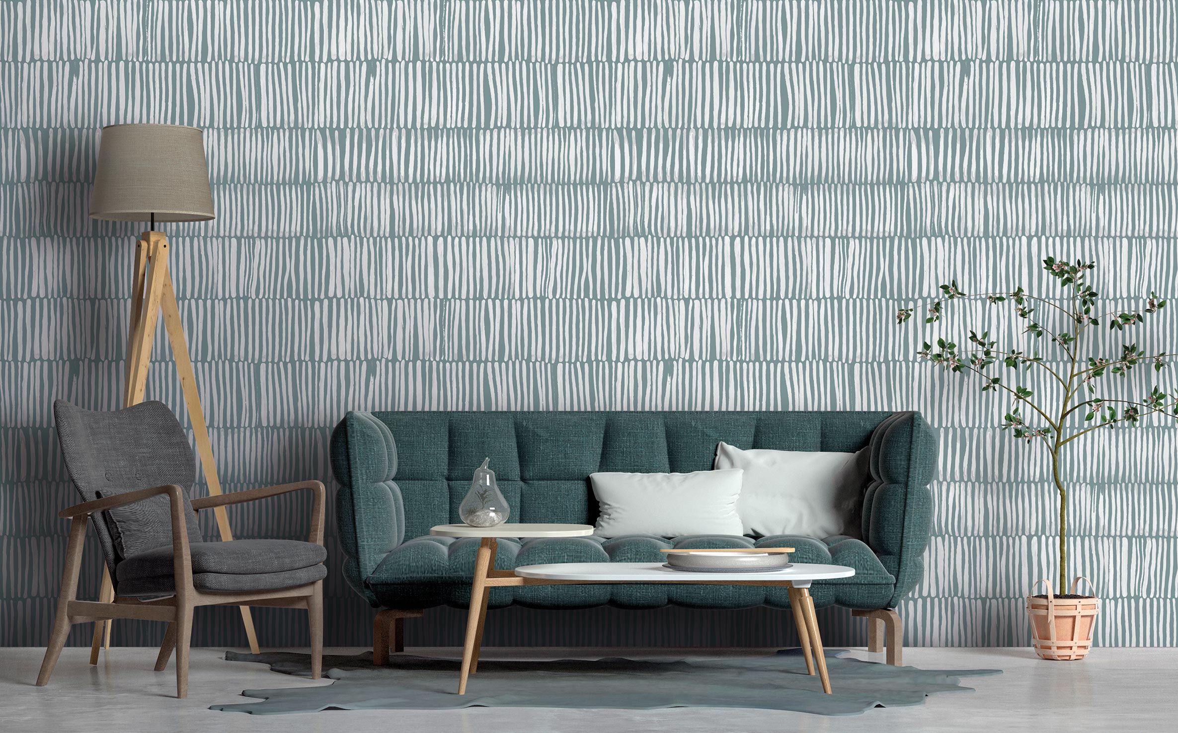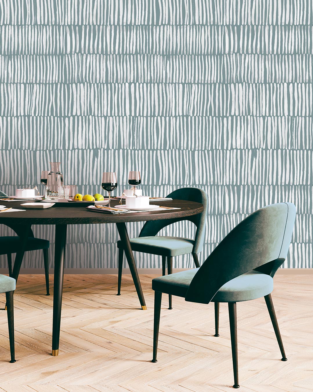 Le papier peint aux petites lignes imparfaites mais charmantes se décline en 4 duos de couleurs : fond bleu ou vert et traits blancs, fond brun et traits gris, fond noir et traits marron.