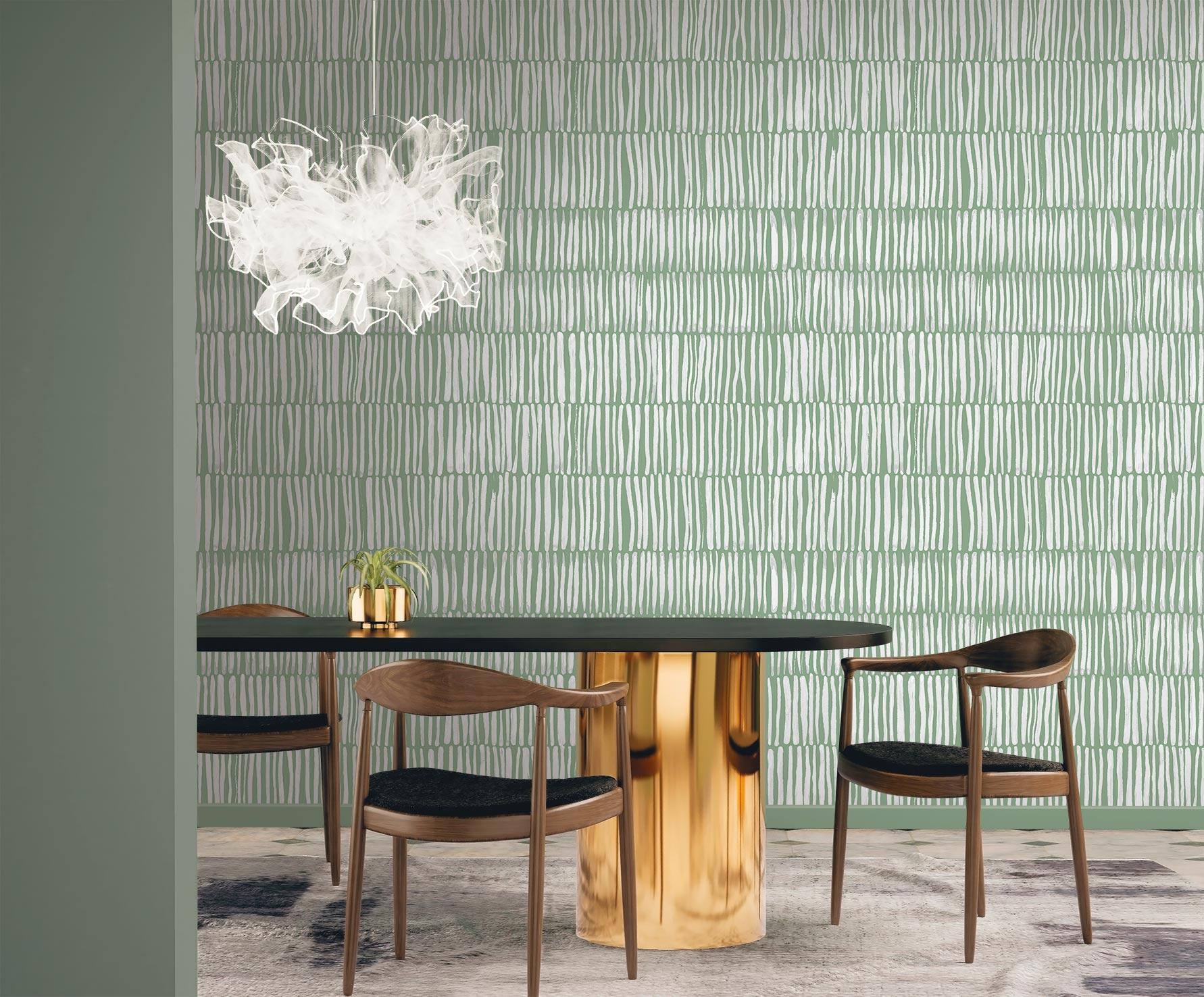 Plusieurs séries de lignes verticales sont disposées les unes sur les autres. Les lignes ne sont pas droites sur le décor mural, elles fluctuent comme s’il s’agissait d’un matériau naturel : du bois ou des bambous. La tapisserie peut s’inscrire dans un style ethnique.