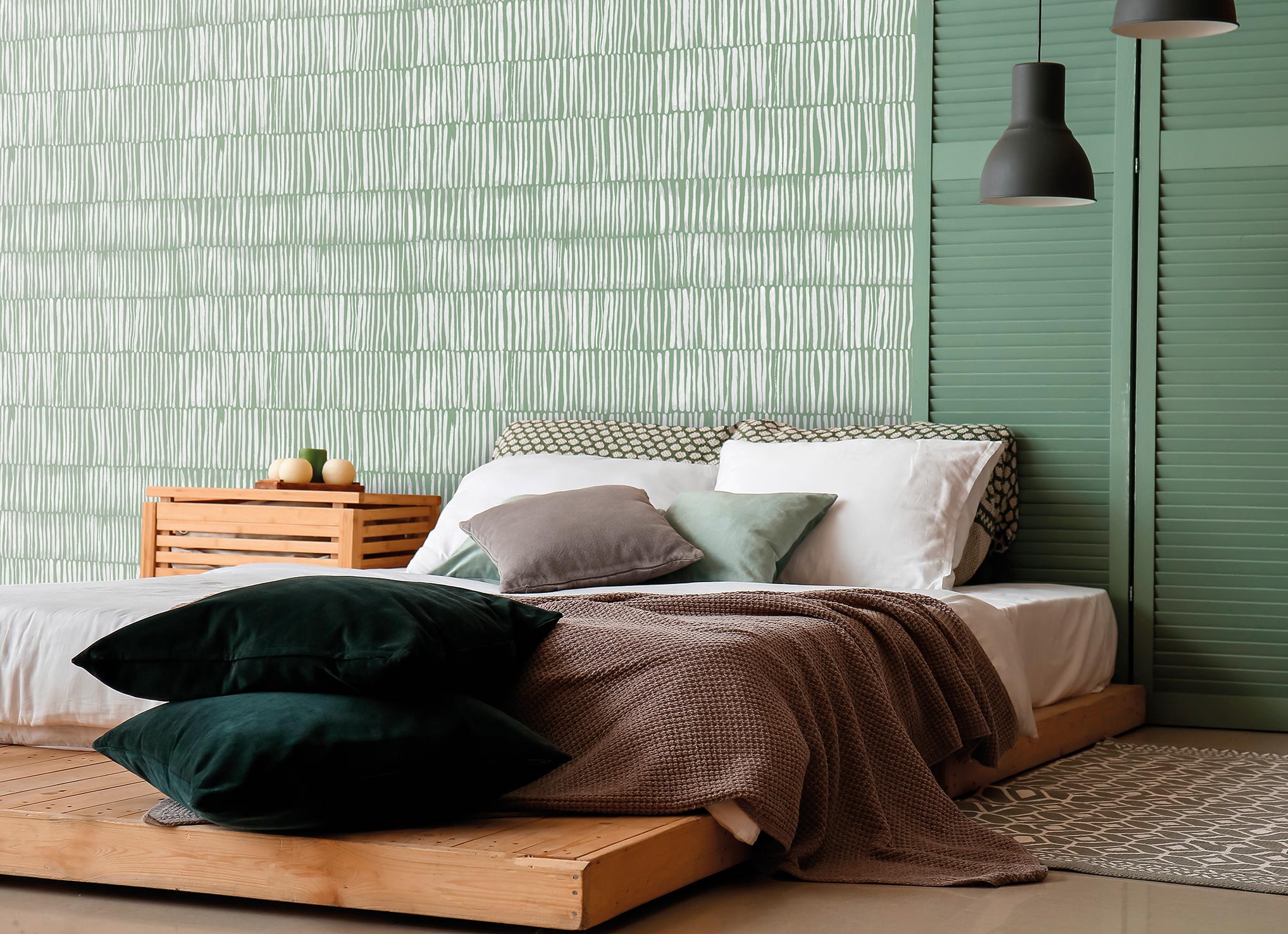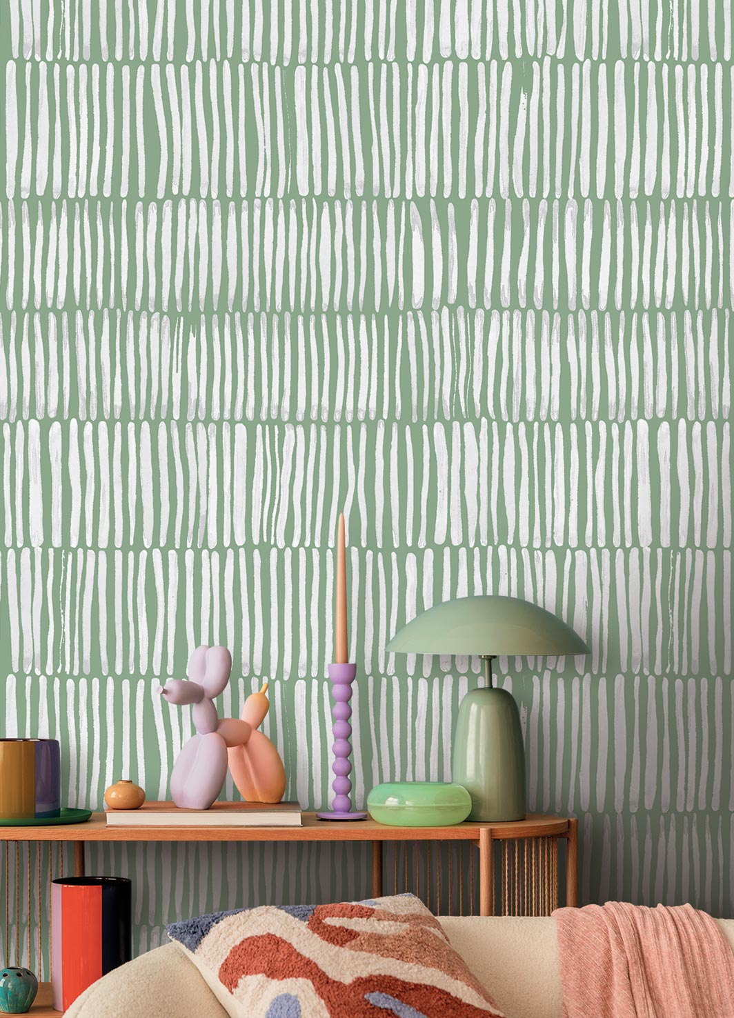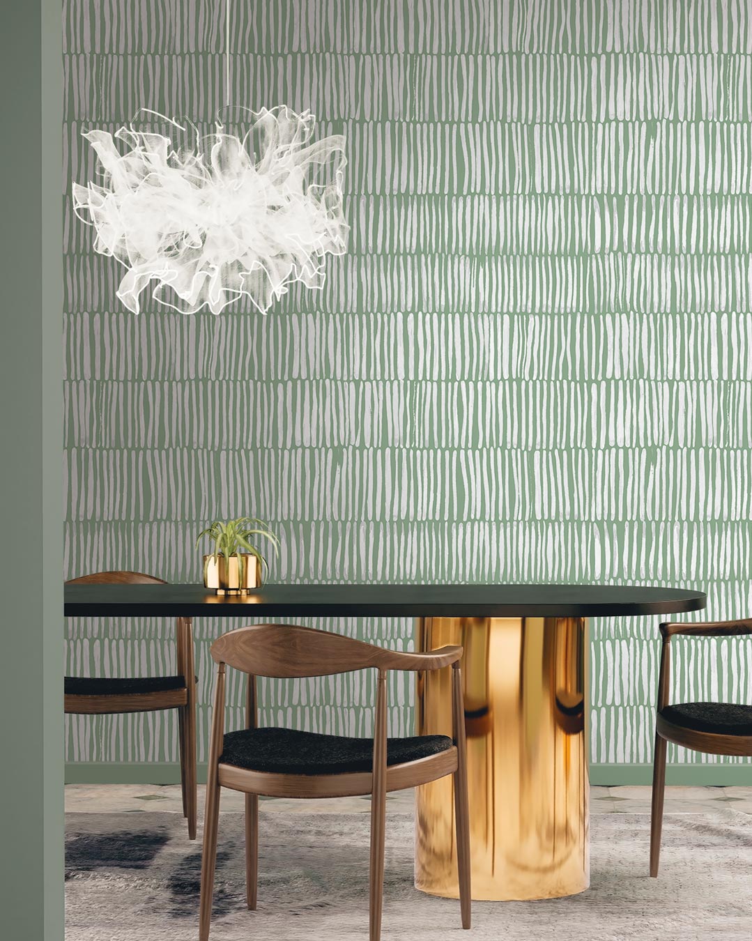 Le papier peint aux petites lignes imparfaites mais charmantes se décline en 4 duos de couleurs : fond bleu ou vert et traits blancs, fond brun et traits gris, fond noir et traits marron.