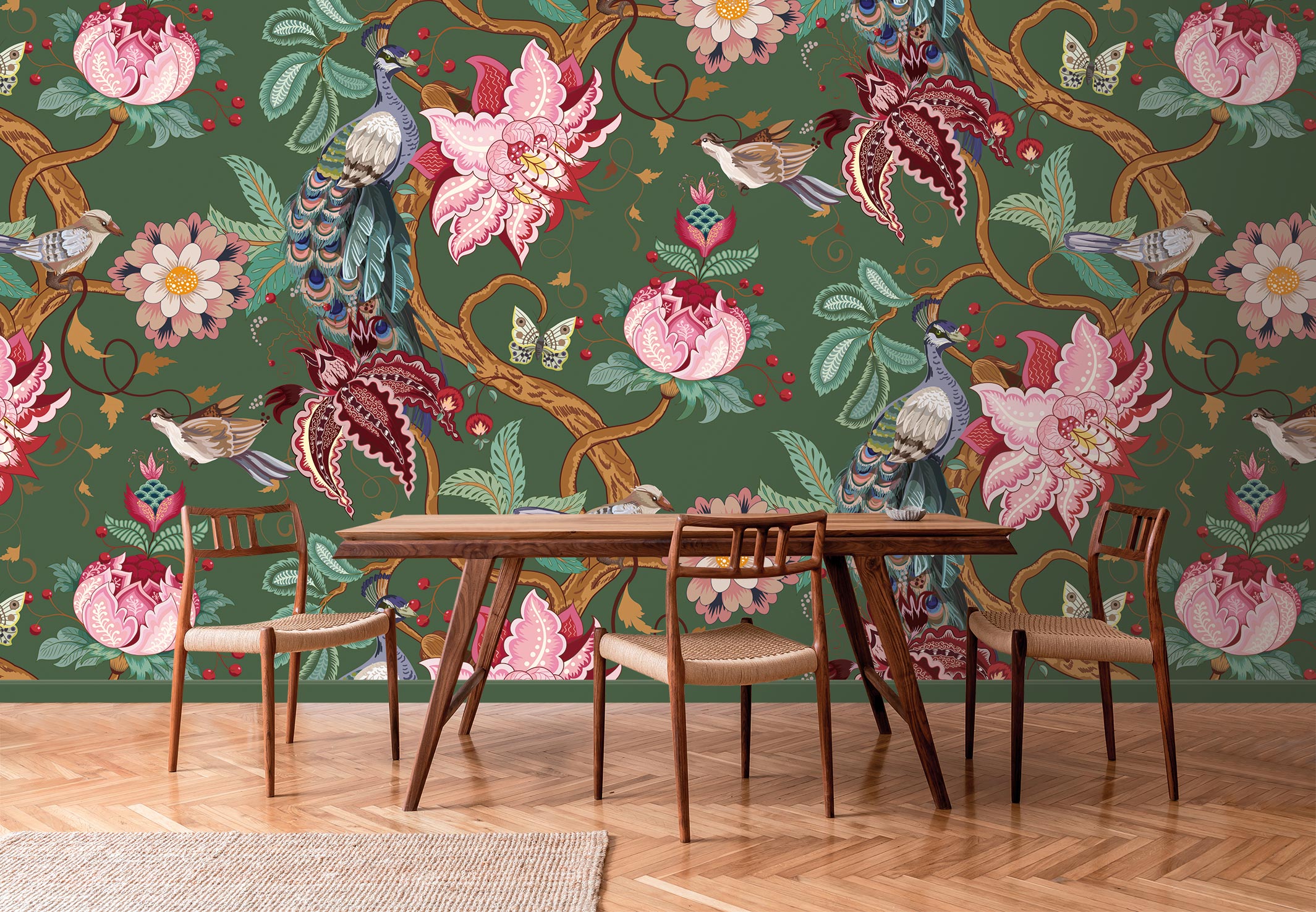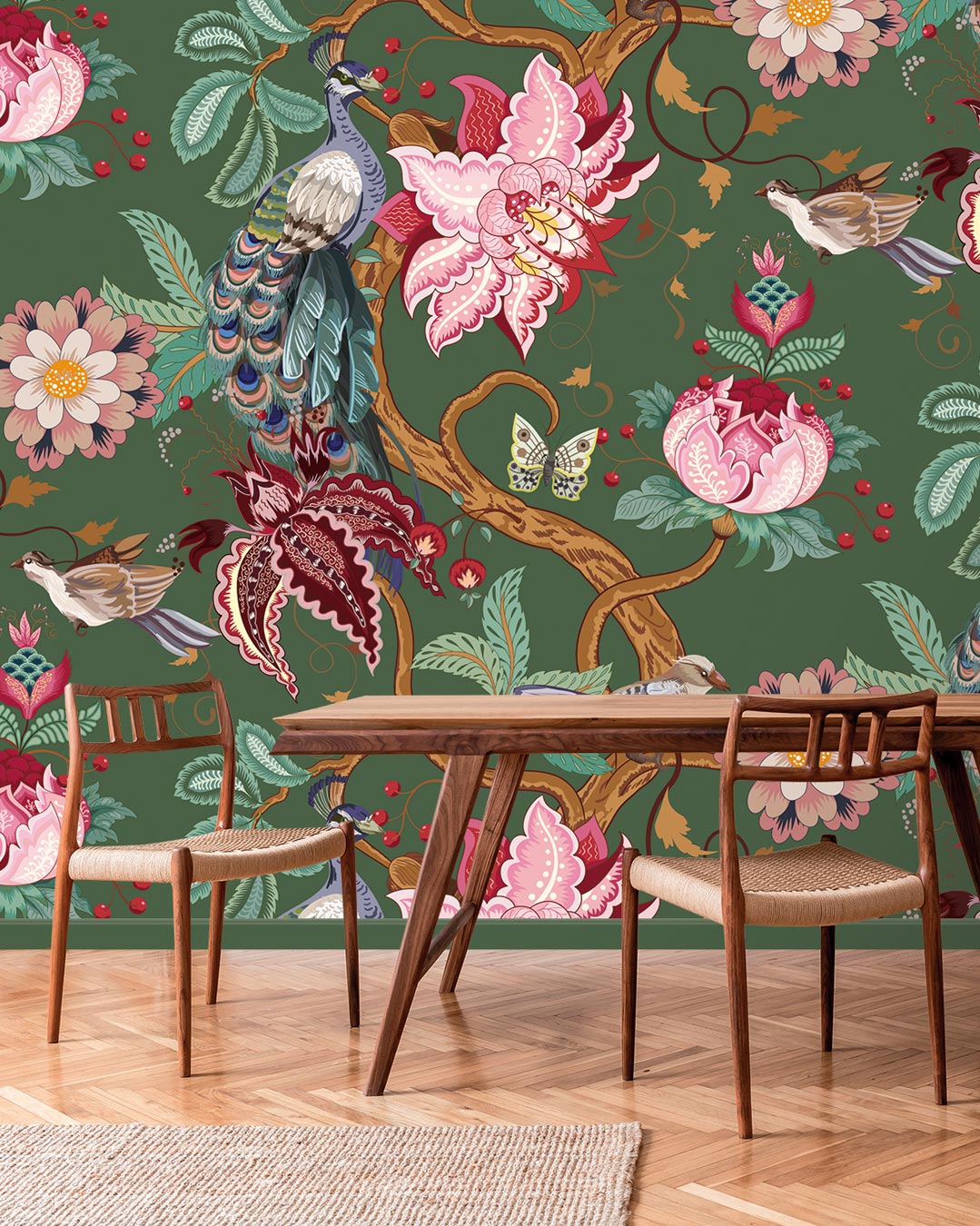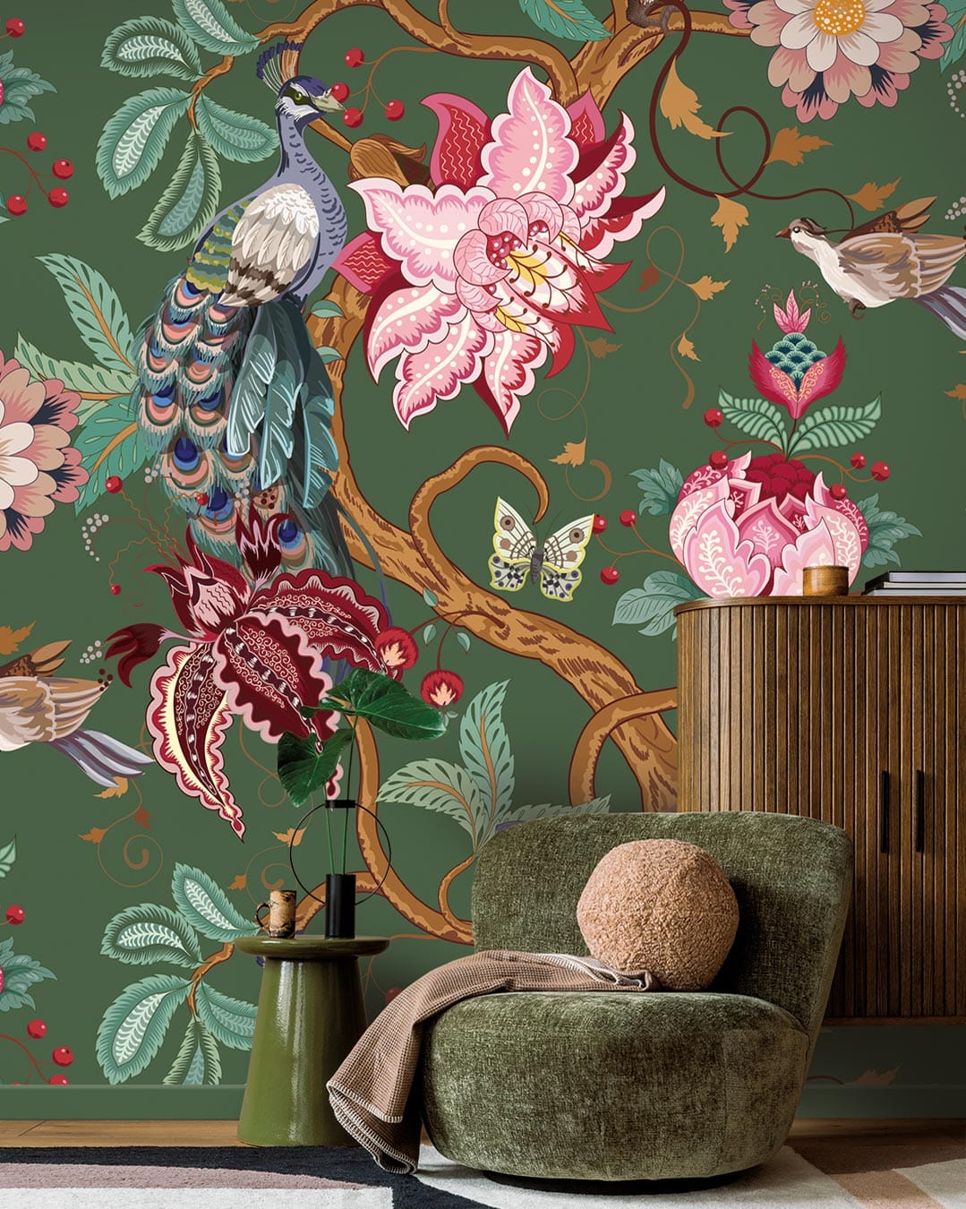 Le papier peint PAVO signe une nature sublimée et colorée. Comme un tissu d’ornement, la tapisserie propose un épanouissement végétal idéalisé. Sur de larges branches marron qui forment des lignes courbes, des fleurs et des feuilles déploient avec grandiloquence des teintes savoureuses et des détails à foison. Des papillons, des oiseaux et de gracieux paons complètent le décor mural qui penche du côté de l’Asie.