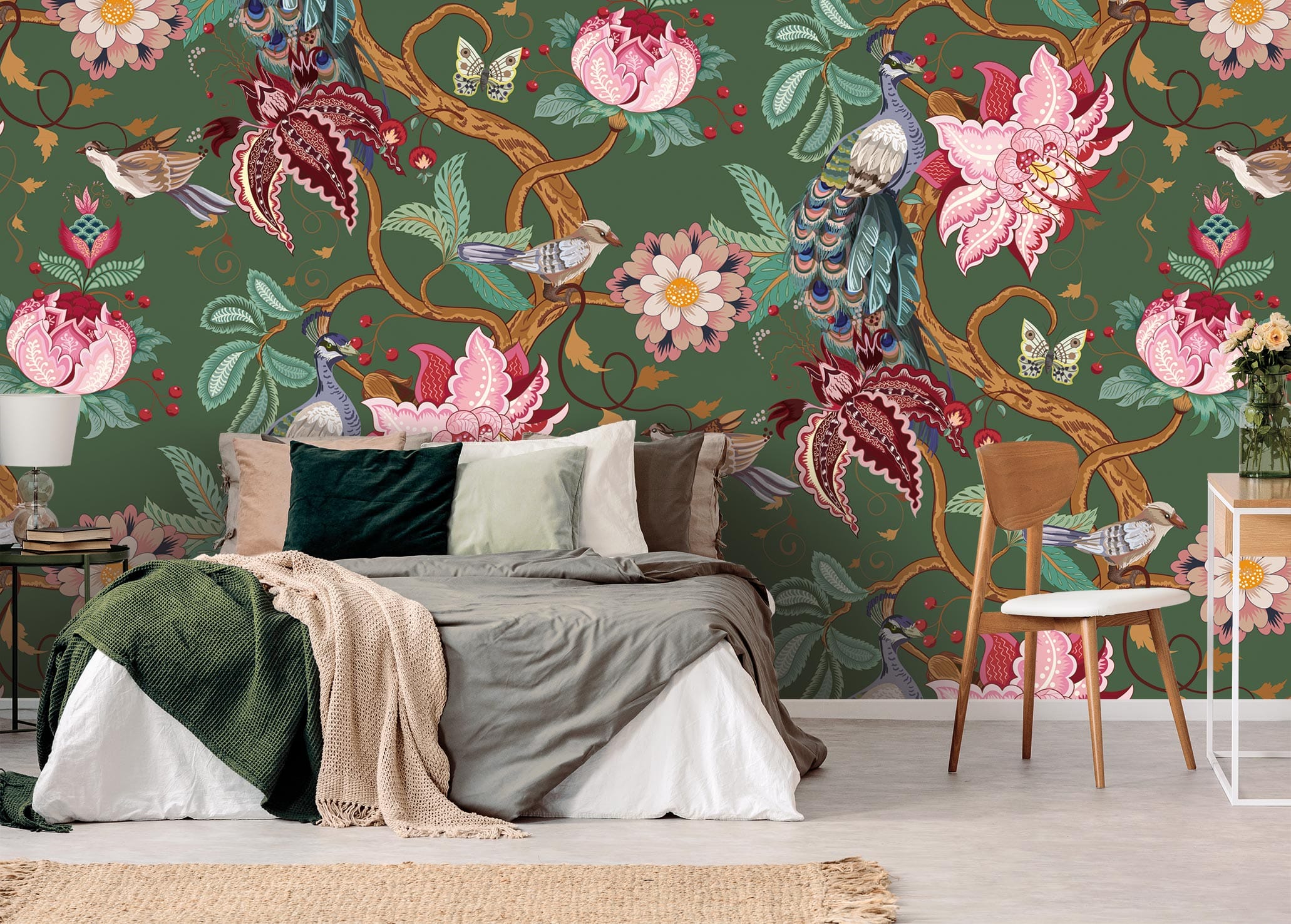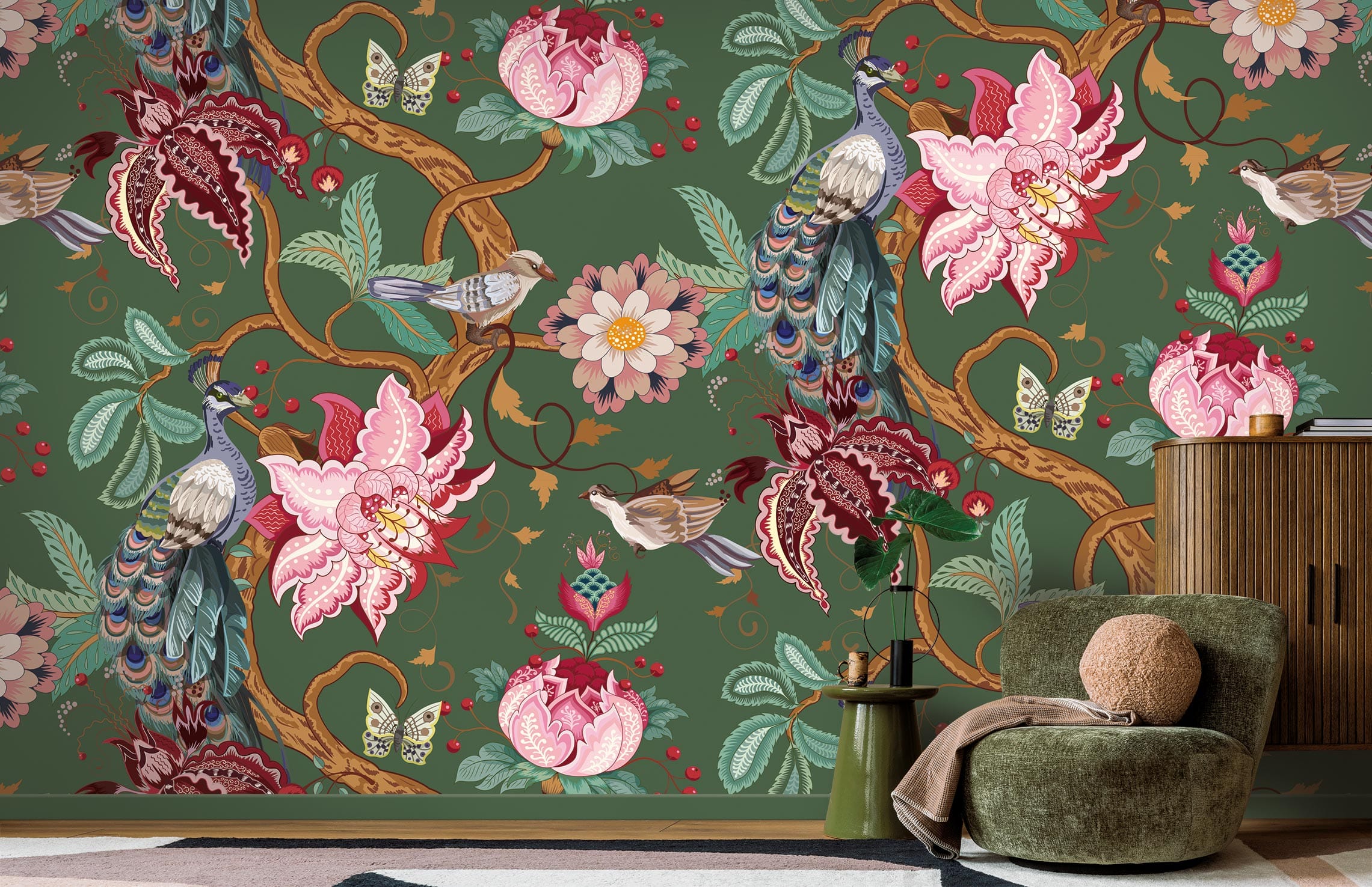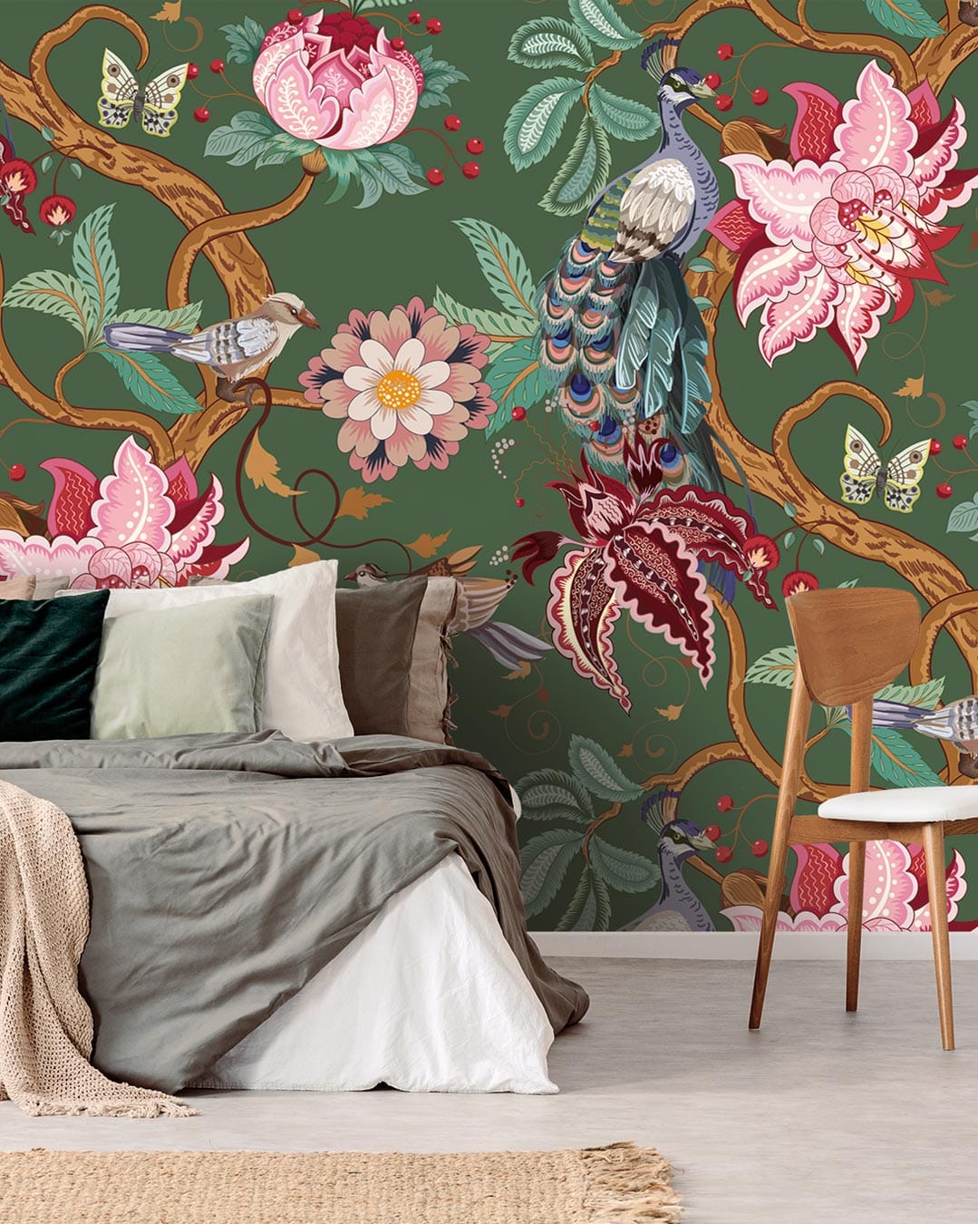 Le papier peint PAVO signe une nature sublimée et colorée. Comme un tissu d’ornement, la tapisserie propose un épanouissement végétal idéalisé. Sur de larges branches marron qui forment des lignes courbes, des fleurs et des feuilles déploient avec grandiloquence des teintes savoureuses et des détails à foison. Des papillons, des oiseaux et de gracieux paons complètent le décor mural qui penche du côté de l’Asie.