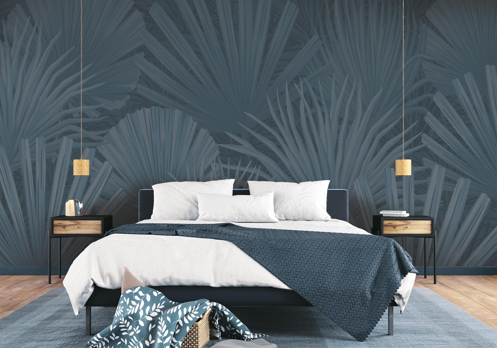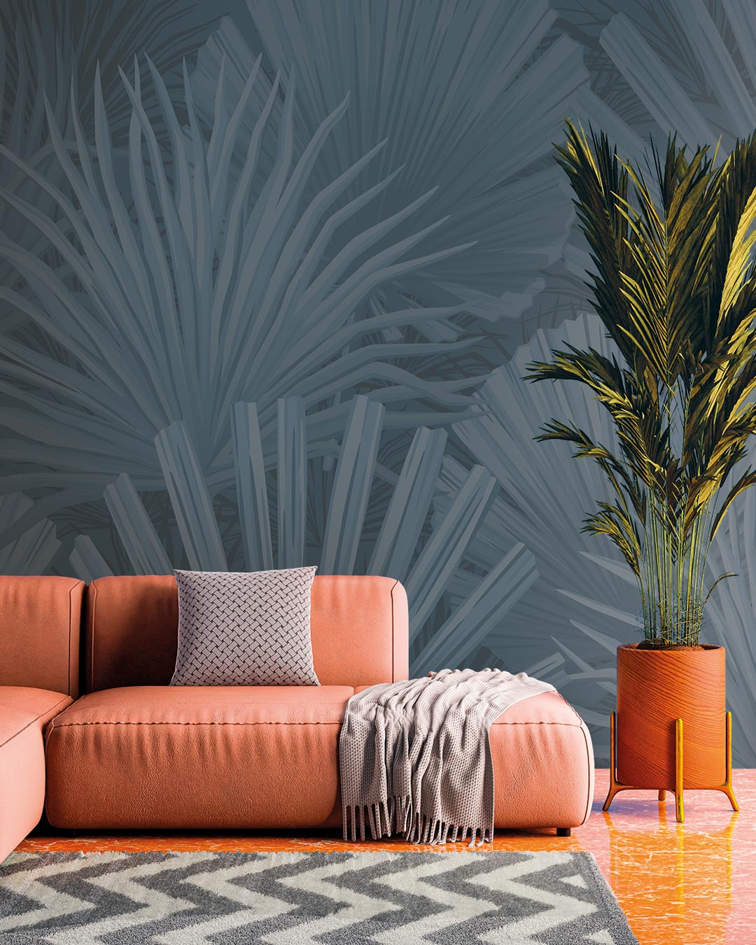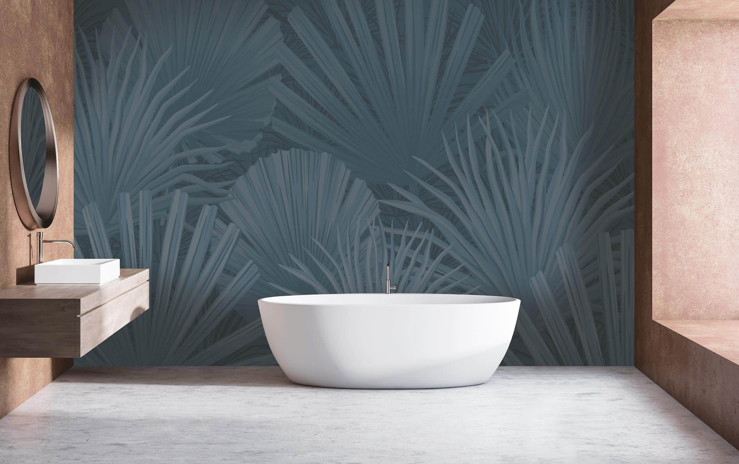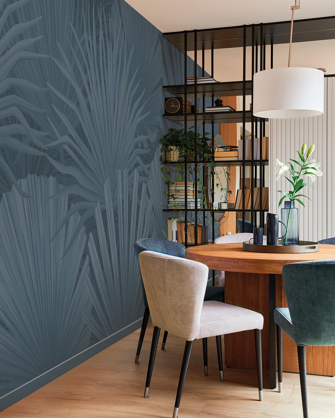 Intimiste, délicate et douce, la tapisserie glorifie le végétal, et en particulier le palmier. Les feuilles costapalmées s’exposent comme des éventails et se superposent tout en laissant passer le fond coloré. Les dessins subtils se déclinent en trois décors muraux : un duo de bleu, un duo de vert ou un duo de beige.