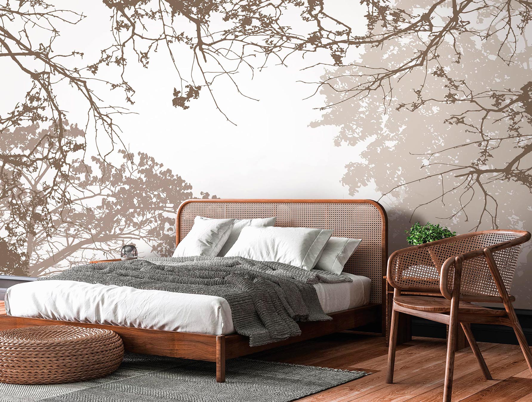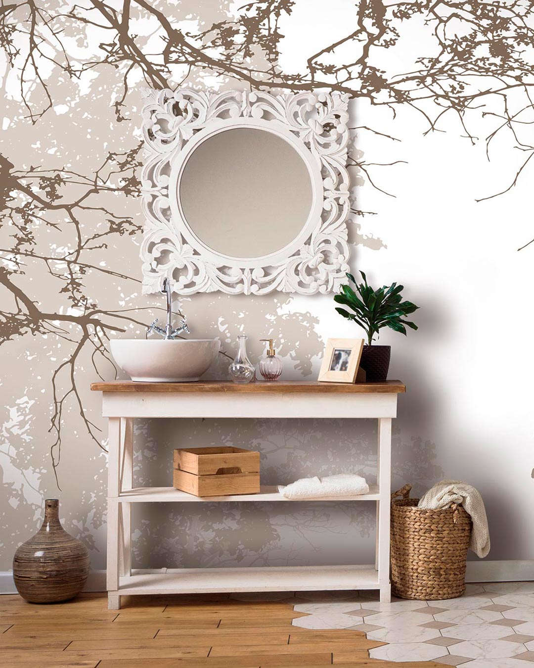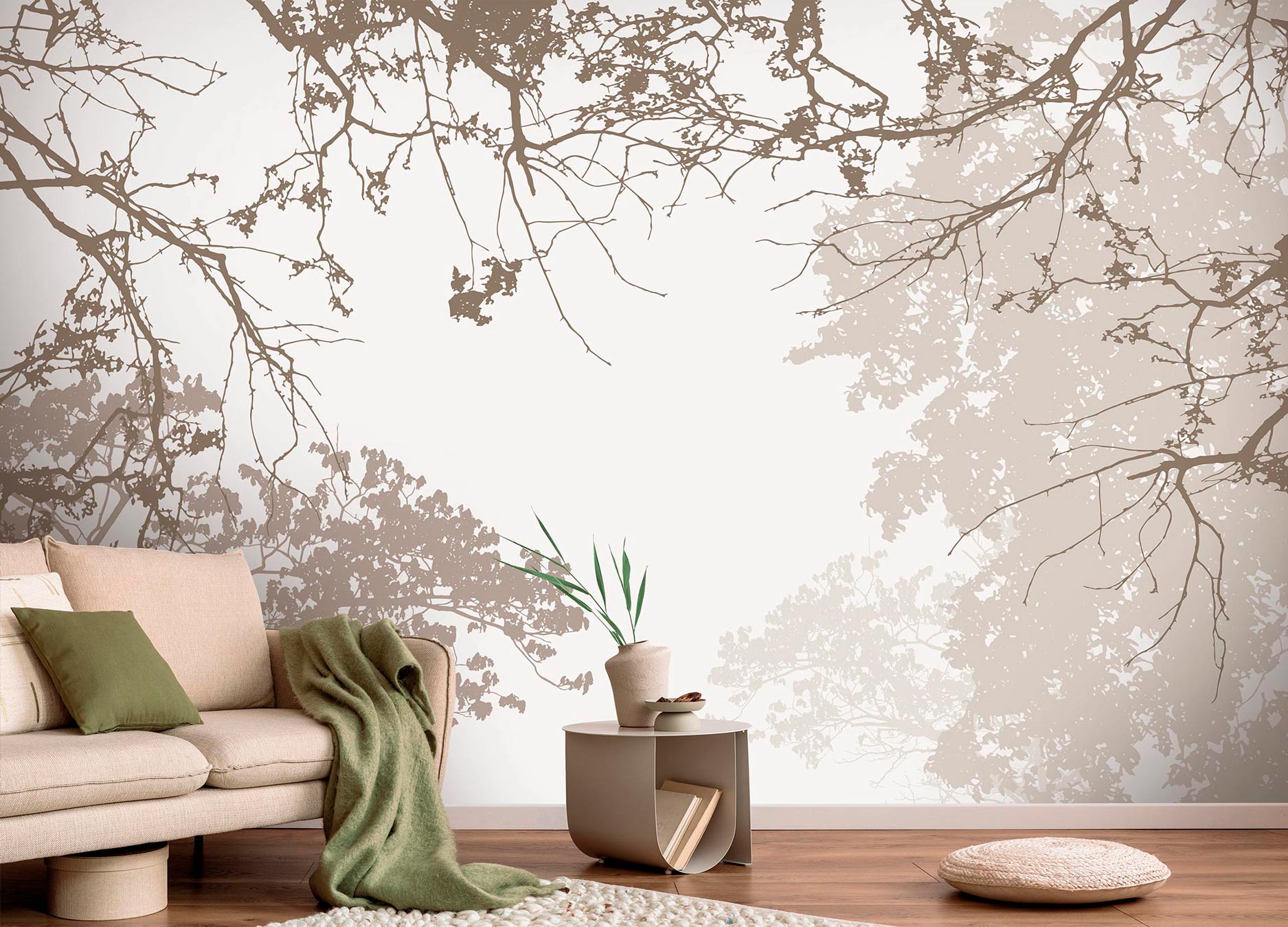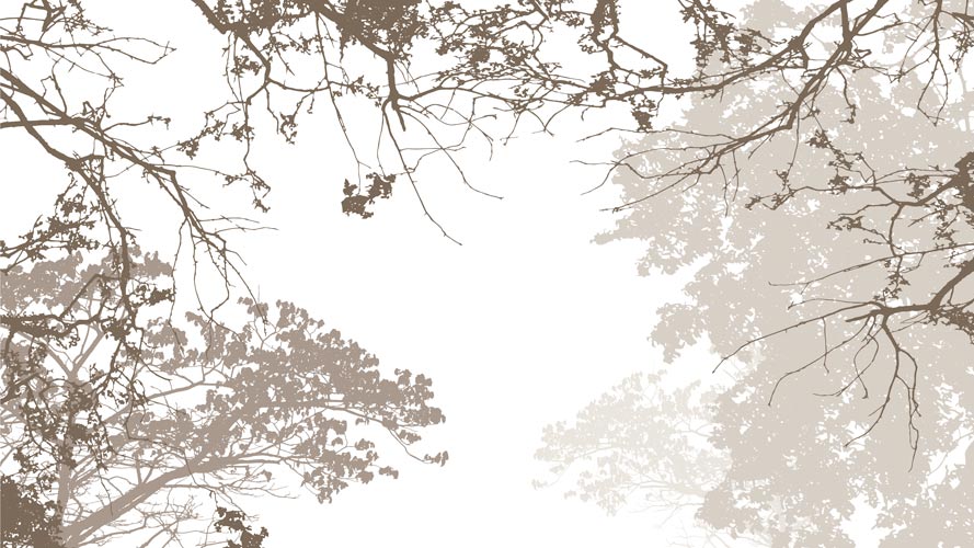 Le papier peint « RAMOS » nous place sous une branche, dans un jardin ou dans une forêt. Le dessin du décor mural se décline en noir et gris très clair. Le vent d’automne a fait son œuvre car quelques feuilles ont déjà disparu. Plusieurs plans habillent la tapisserie. Les couleurs s’éclaircissent d’avant en arrière. Un voile nuageux gris clair recouvre l’arbre de l’arrière-plan, comme un brouillard d’hiver épais. La nature s’expose ici sans fard, dans son habit le plus simple avec une grande sobriété.