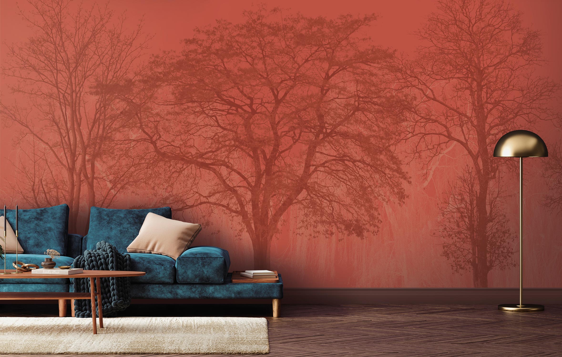 Le papier peint nous plonge au cœur d’un bois, à l’abri des arbres gigantesques. Le modèle se décline en plusieurs versions ajoutant un filtre coloré sur le papier peint : vert clair, rouge orangé, vert kaki et beige rosé. Les différentes teintes créent des univers particuliers qui changent l’ambiance du décor mural et végétal.