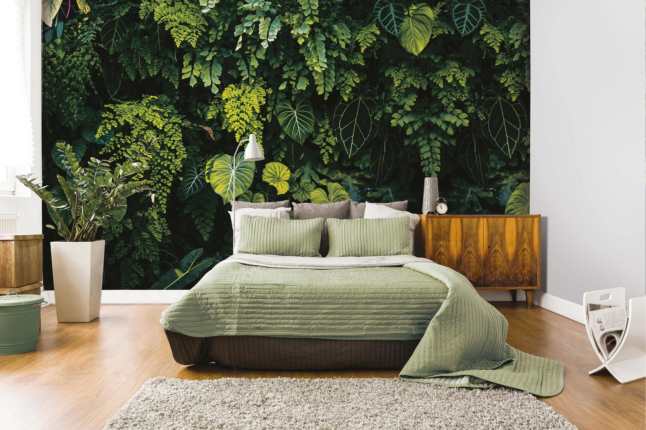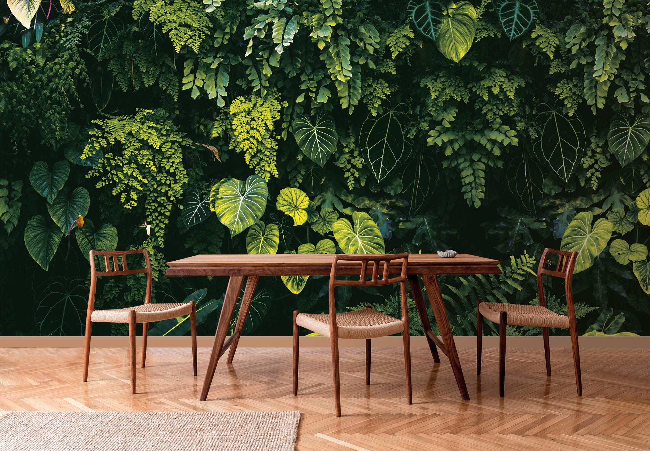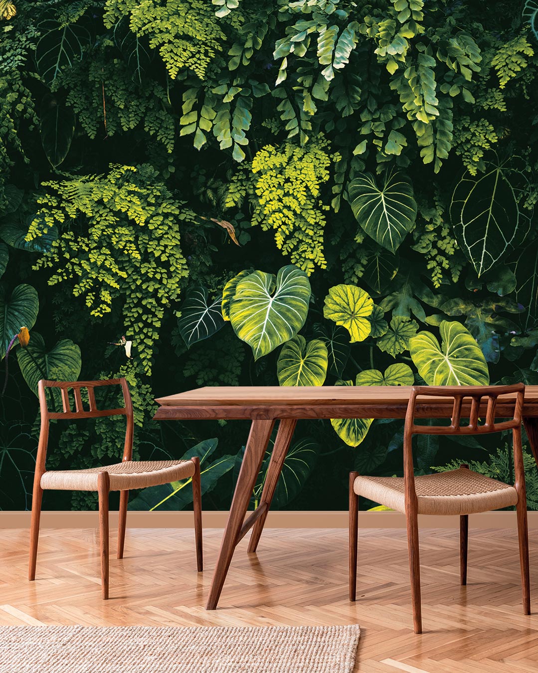 Le papier peint VEGETA est une composition de feuilles, un hommage au végétal. Dans des verts intenses (version chlorophylle) et des verts foncés (presque bleutés), différents végétaux se côtoient (fougères, larges feuilles…). La profondeur et la densité sombre du fond laissent à penser que la nature est épaisse est fournie. Chaque détail des feuillages est représenté sur le décor mural (tiges, nervures, limbes…). Les jeux d’ombre et de lumière offrent un charme naturel et réaliste à la tapisserie.